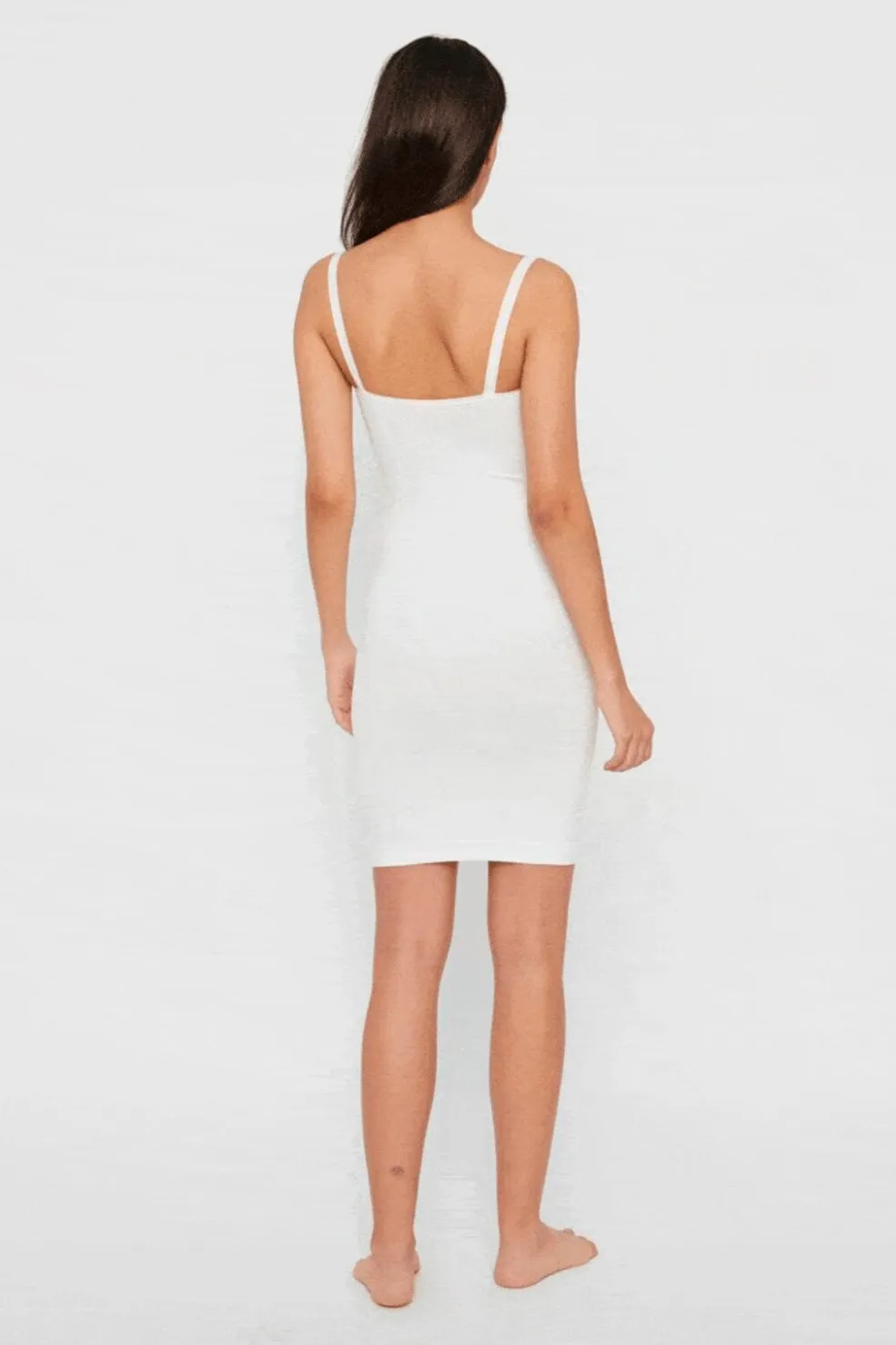 Hvid lang singlet fra Pieces med tynde spaghettistropper og V-udskæring. Den tætsiddende top er fremstillet i strækbart materiale med en lang pasform.