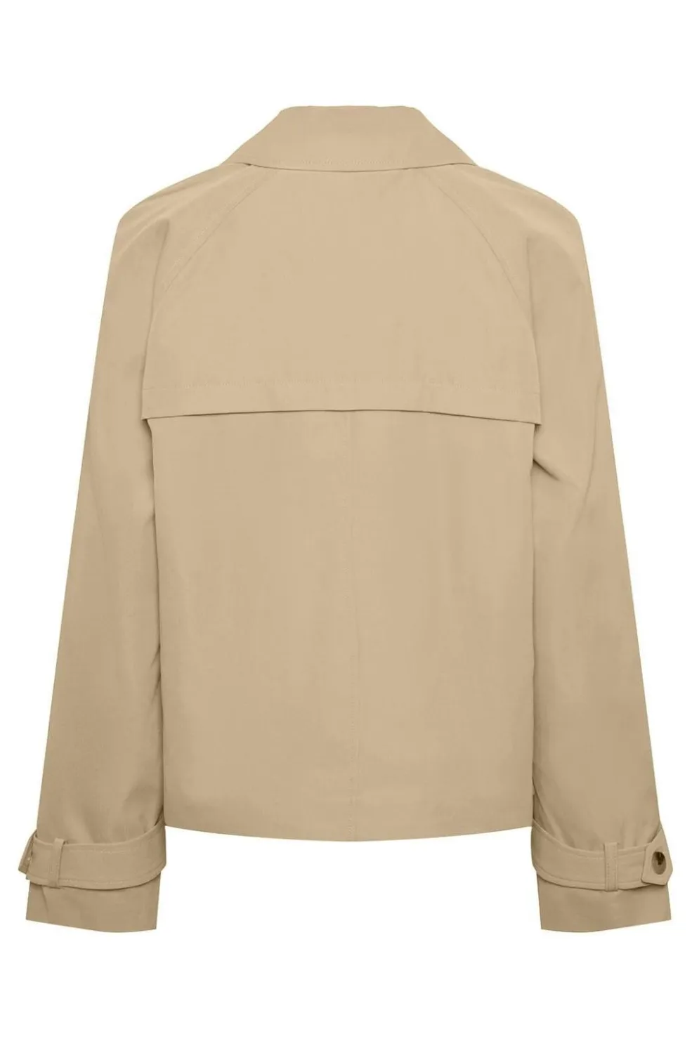 Kort trenchcoat fra Pieces i sandfarvet polyester. Jakken har dobbeltradet knaplukning og skjortekrave. Den korte model giver god bevægelsesfrihed og er nem at style.