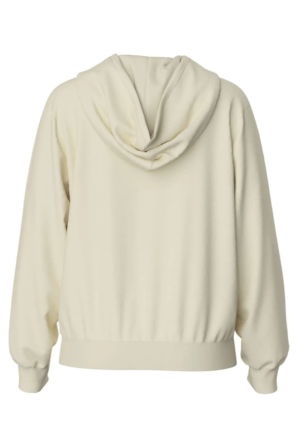 Hættetrøje fra Pieces i en lys cremefarvet nuance. Den har lynlåslukning foran og to praktiske frontlommer, der gør den anvendelig til både hjemmebrug og aktiviteter.