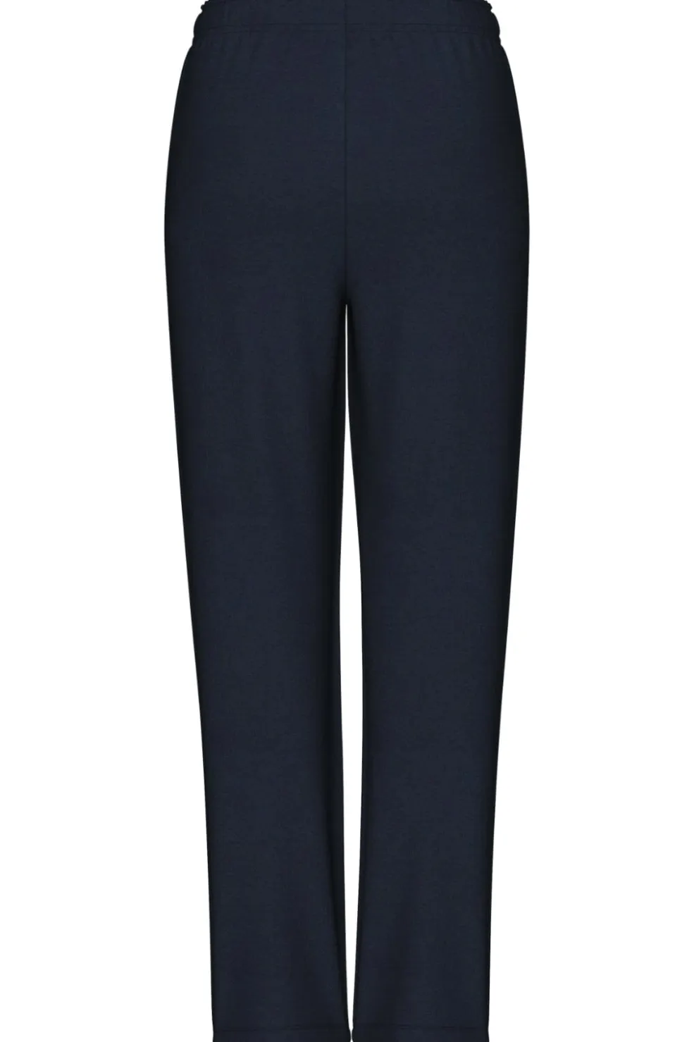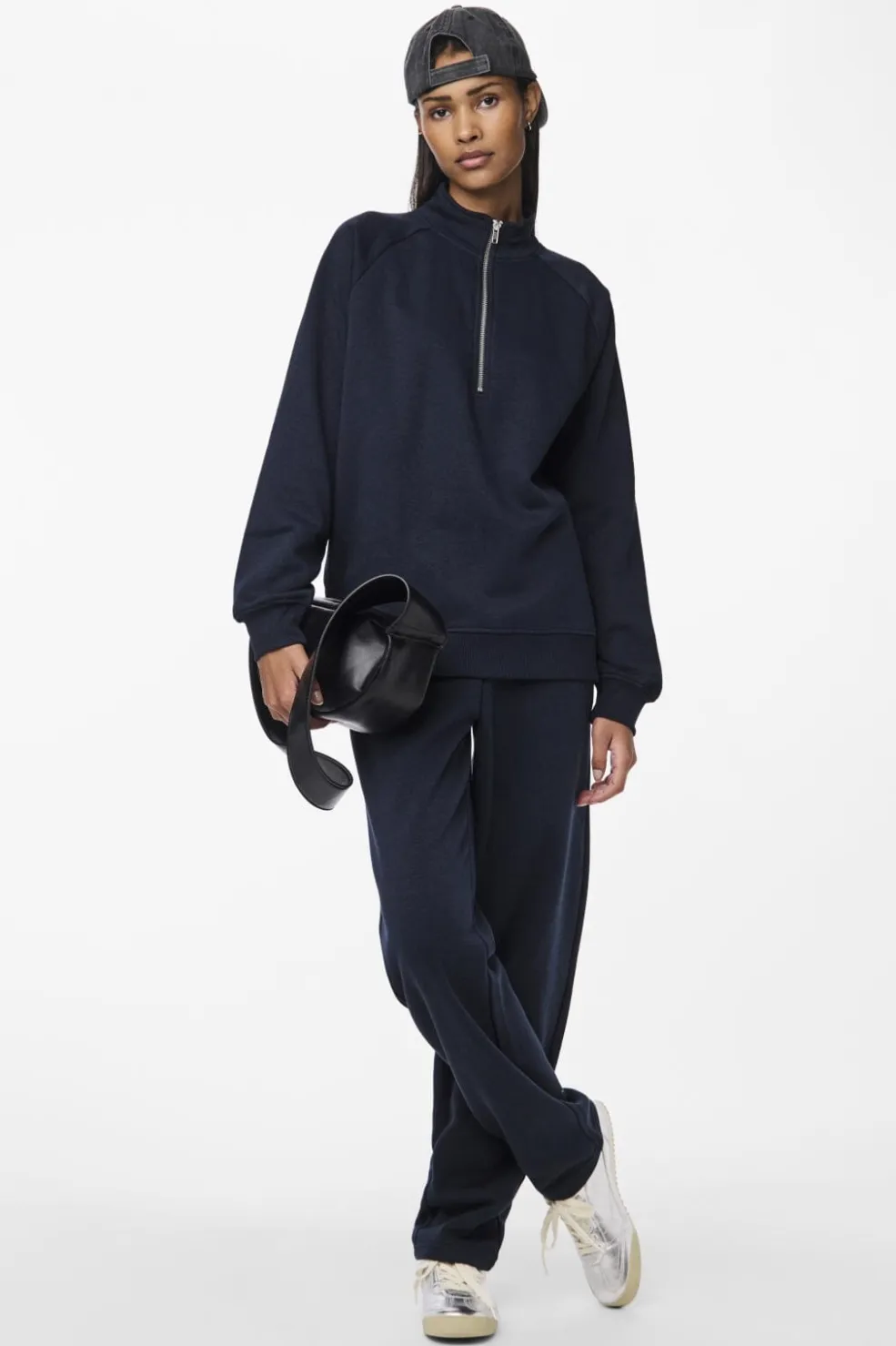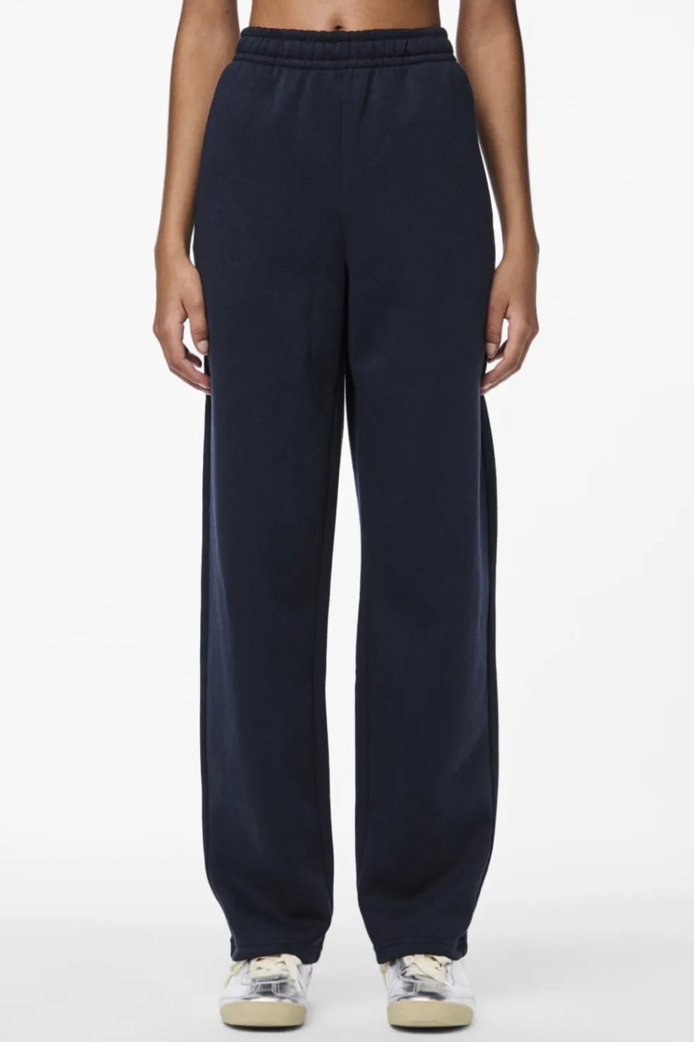 Mørkeblå sweatpants fra Pieces med høj talje og lige ben. Bukserne har sidelommer og en elastisk taljelinning. De er lavet af en blanding af genanvendt polyester og bomuld.