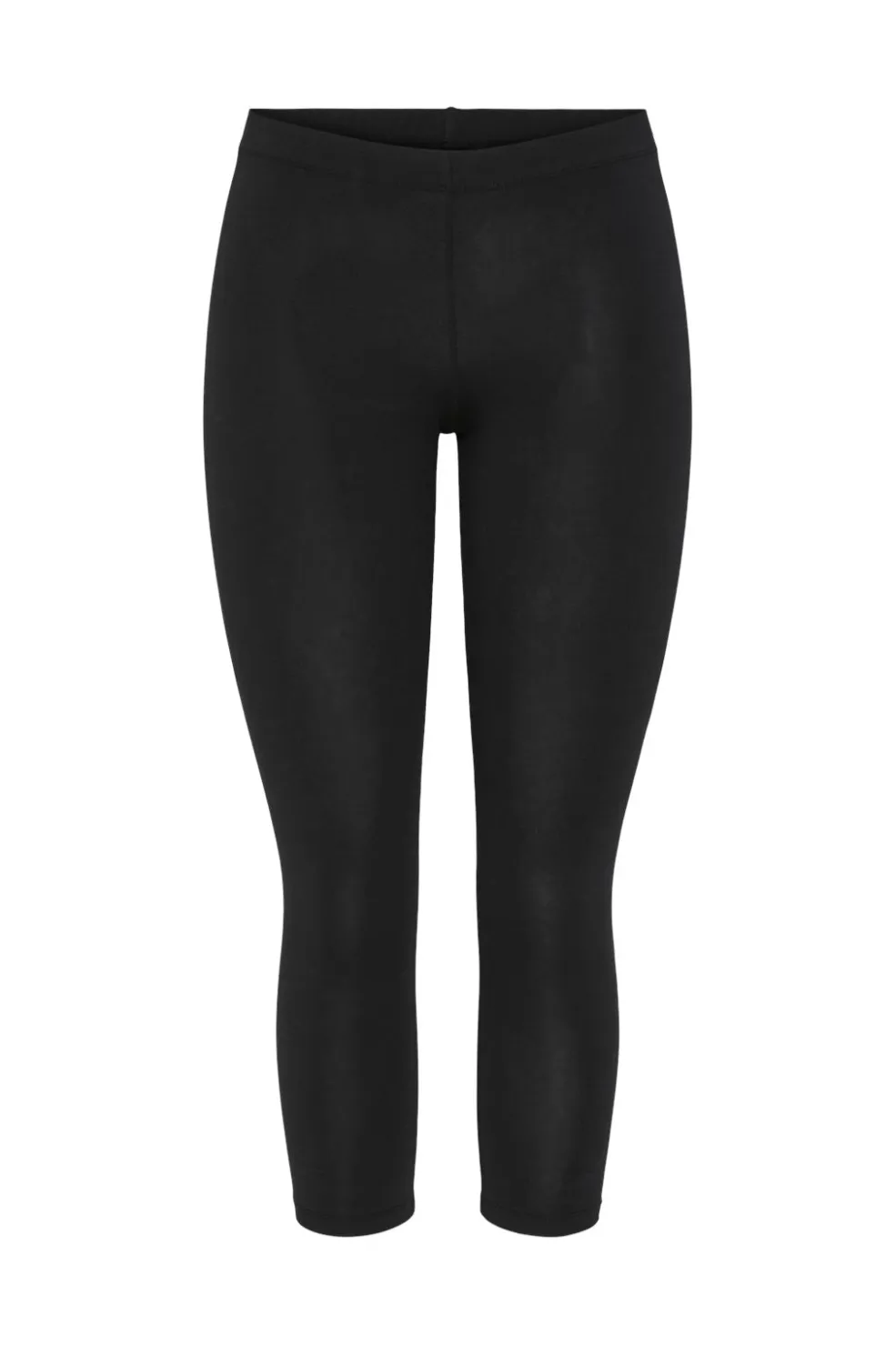 Sorte leggings fra Pieces med tætsiddende pasform og elastisk talje. Leggingsene går til midt på læggen og har en normal taljehøjde.