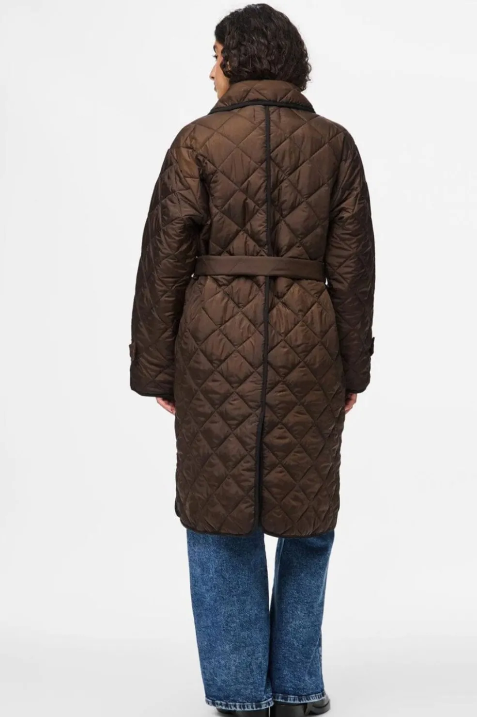 Lang quiltet jakke fra Pieces i mørkebrun Hot Fudge-farve. Jakken har en rundet krave, knapper foran og et bælte i taljen til at justere pasformen.