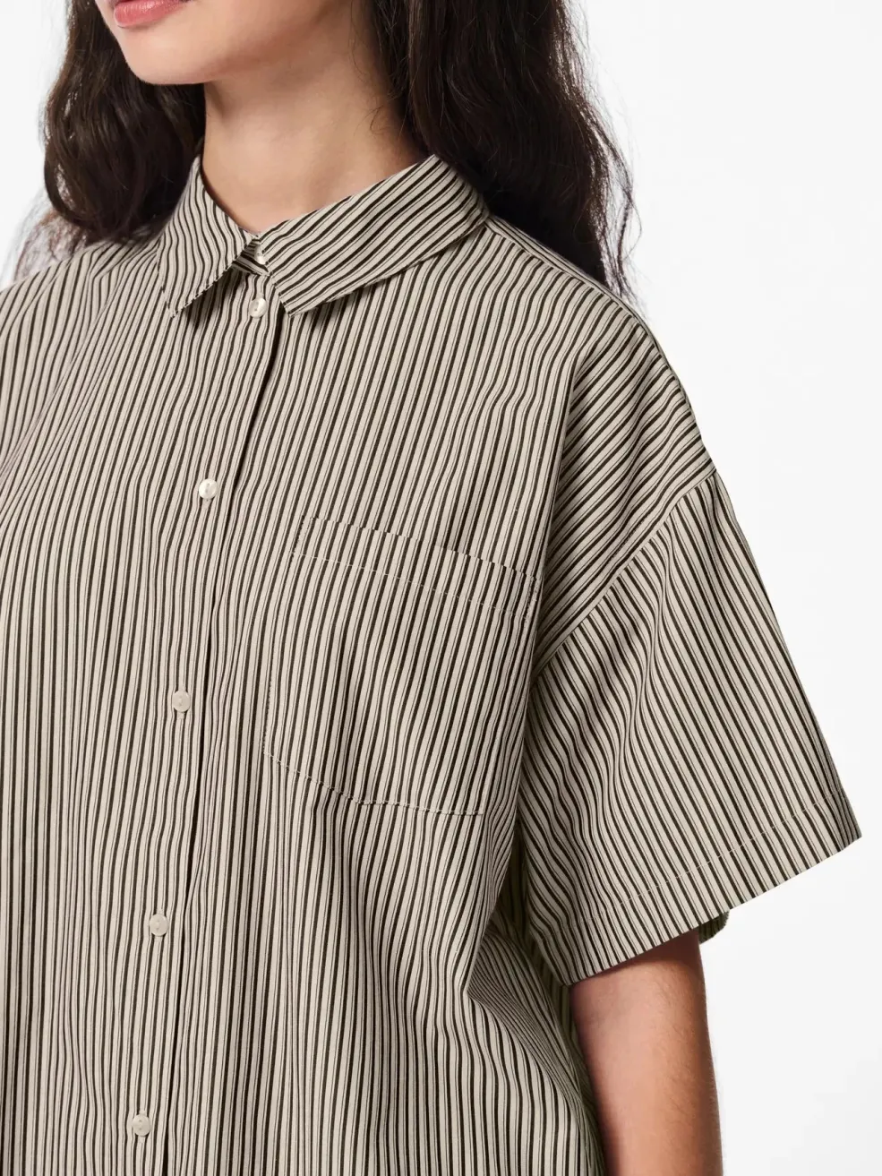 Stribet skjorte fra Pieces i en beige nuance. Skjorten har en løs pasform og korte ærmer; den er lavet af en polyester-bomuldsblanding.