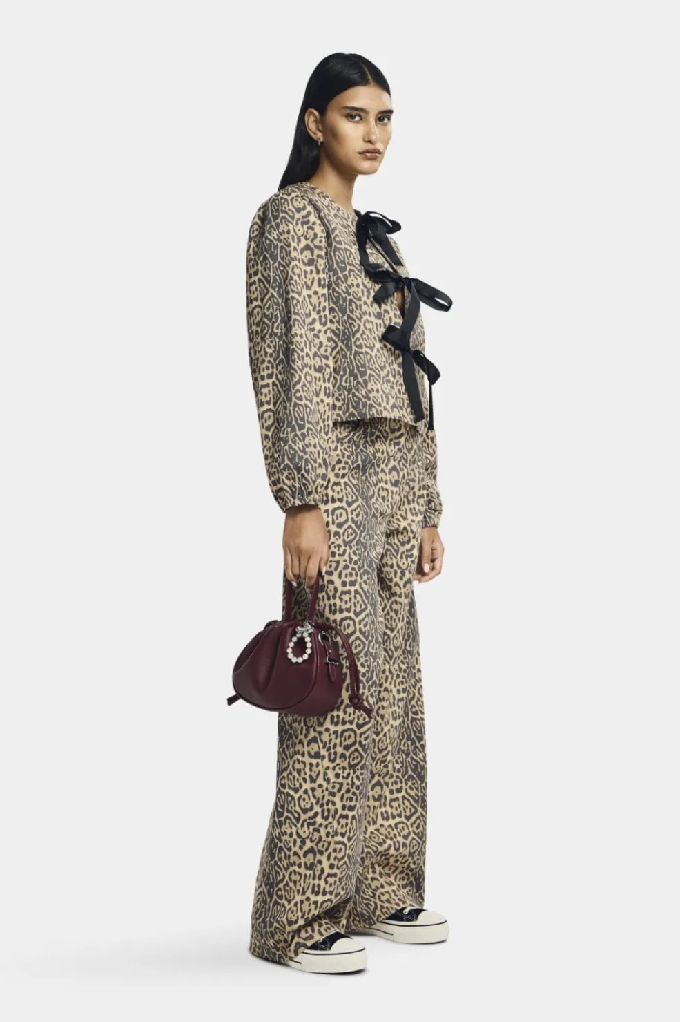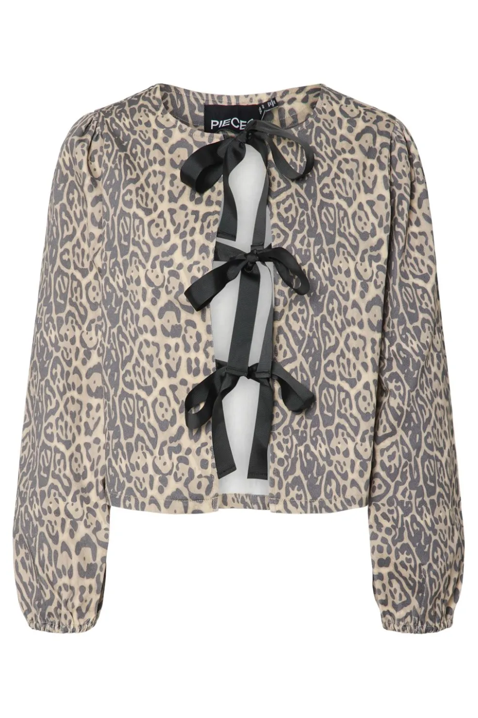 Sort bluse fra Pieces med beige leopardmønster. Den har et reversibelt design med sorte bindebånd foran og lange ærmer med puf-effekt. Blusen har en løs pasform.