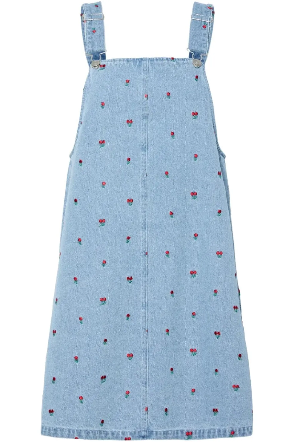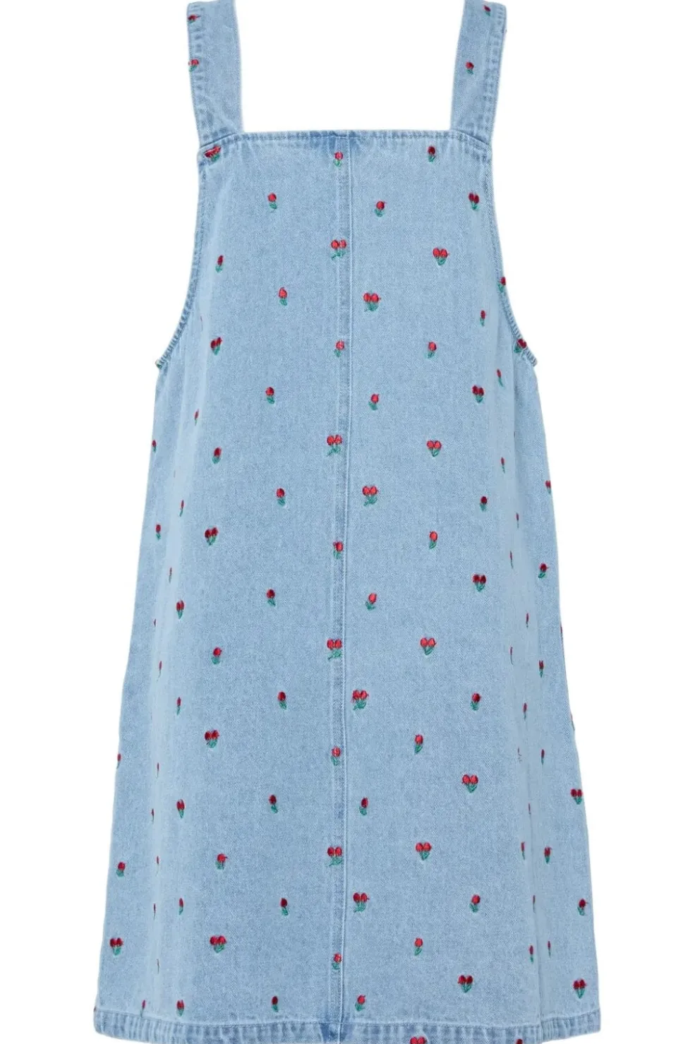 Denimkjole fra Pieces i lys blå med broderede røde tulipaner. Kjolen har en firkantet halsudskæring og justerbare stropper. Den er knælængde med regular fit.