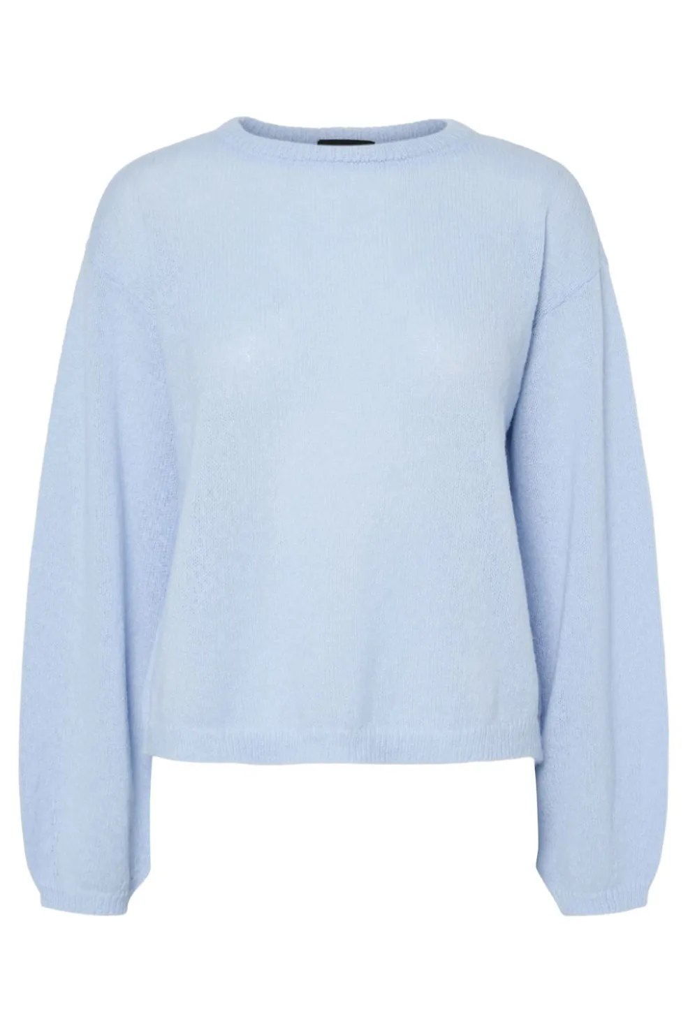 Strikket sweater fra Pieces i en lys cashmere-blå farve. Den har en afslappet pasform med rund halsudskæring og lange ærmer.