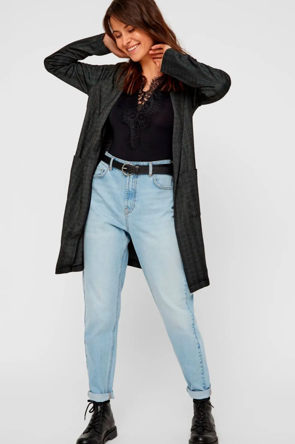 Sort bodystocking fra Pieces med blondedetaljer ved halsen og skuldrene. Den har en dyb V-udskæring og trykknapper mellem benene for nem af- og påklædning.