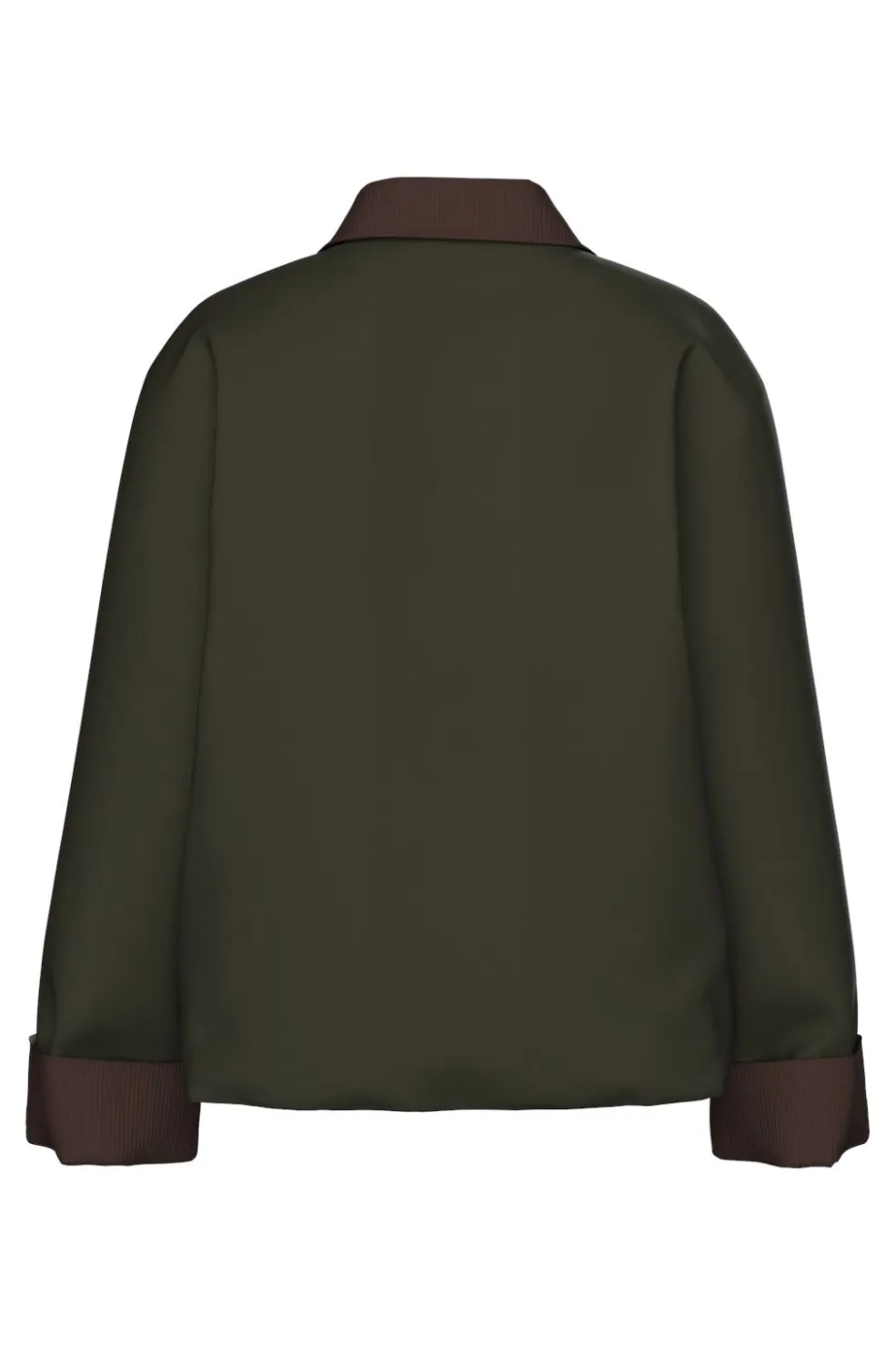 Kort polstret jakke fra Pieces i mørkegrøn med kontrastfarvet brun krave og manchetter. Jakken er lavet af 51 % genanvendt polyester og 49 % polyester.