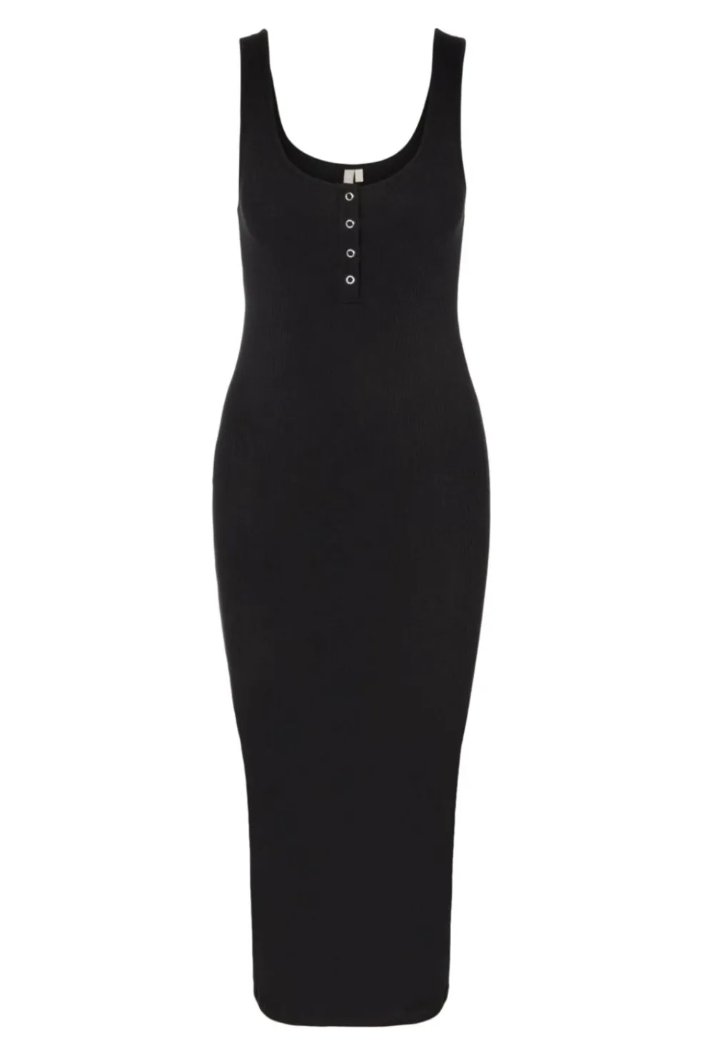 Sort midi-kjole fra Pieces med ribbet struktur og knapdetaljer foran. Kjolen har et ærmeløst design med rund halsudskæring og slim fit-pasform.