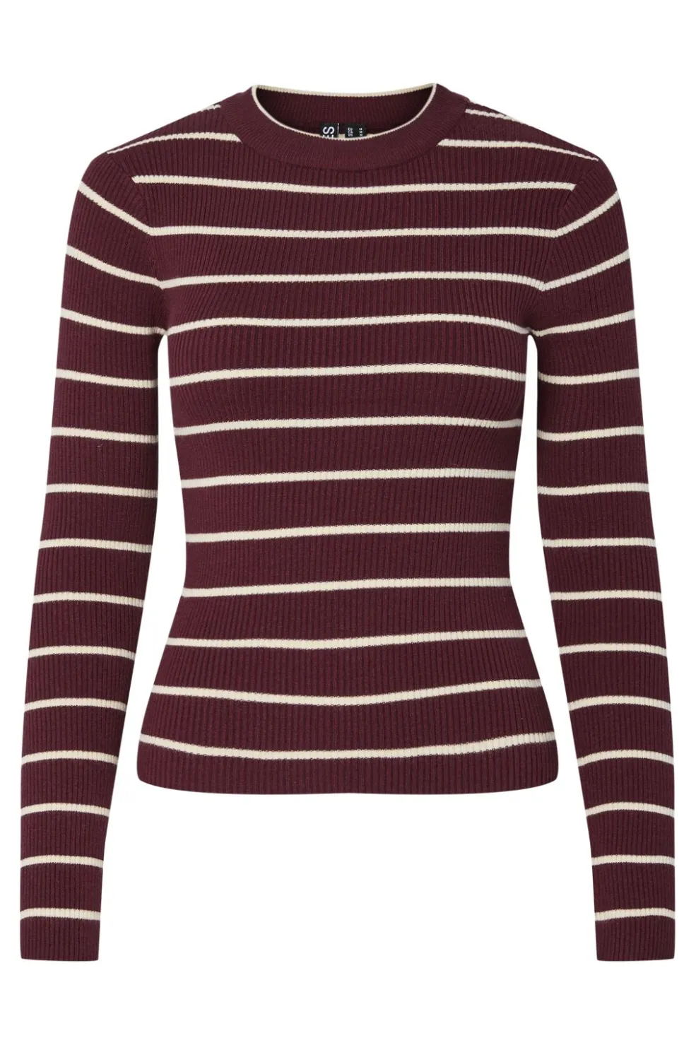 Stribet striktrøje fra Pieces i bordeauxrød med lyse striber. En tætsiddende model med rund hals og lange ærmer i en blød ribstrik.