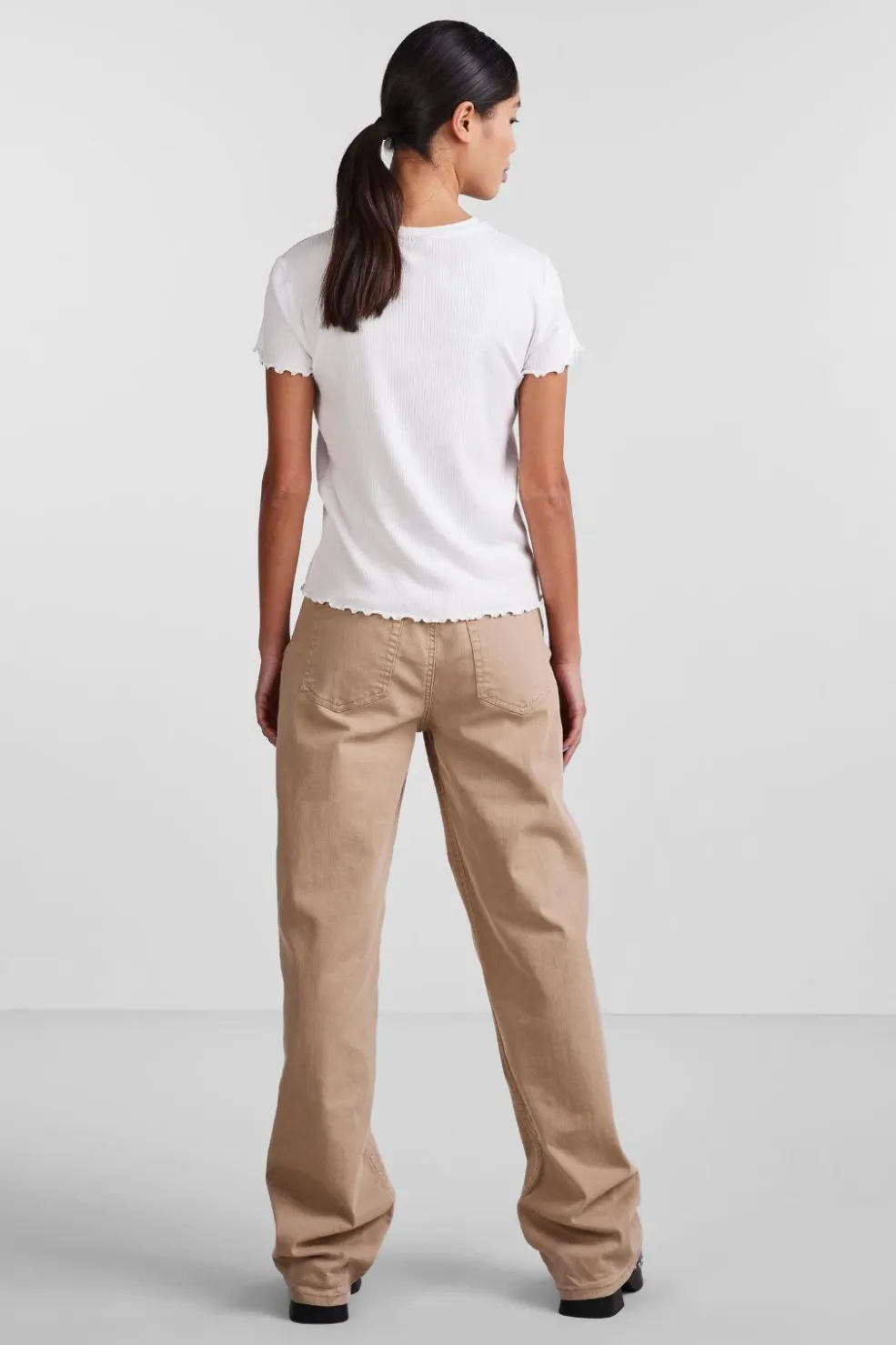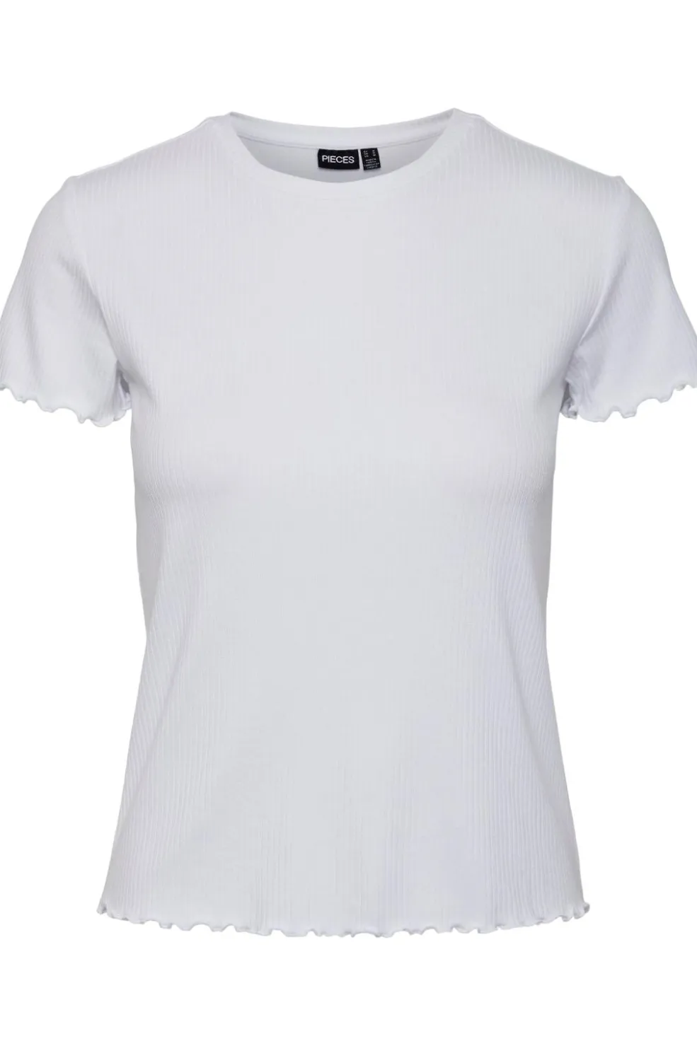 Hvid t-shirt fra Pieces med ribbet tekstur og babylock-kant på ærmerne og bunden. T-shirten har en slim fit-pasform og korte ærmer med rund hals.
