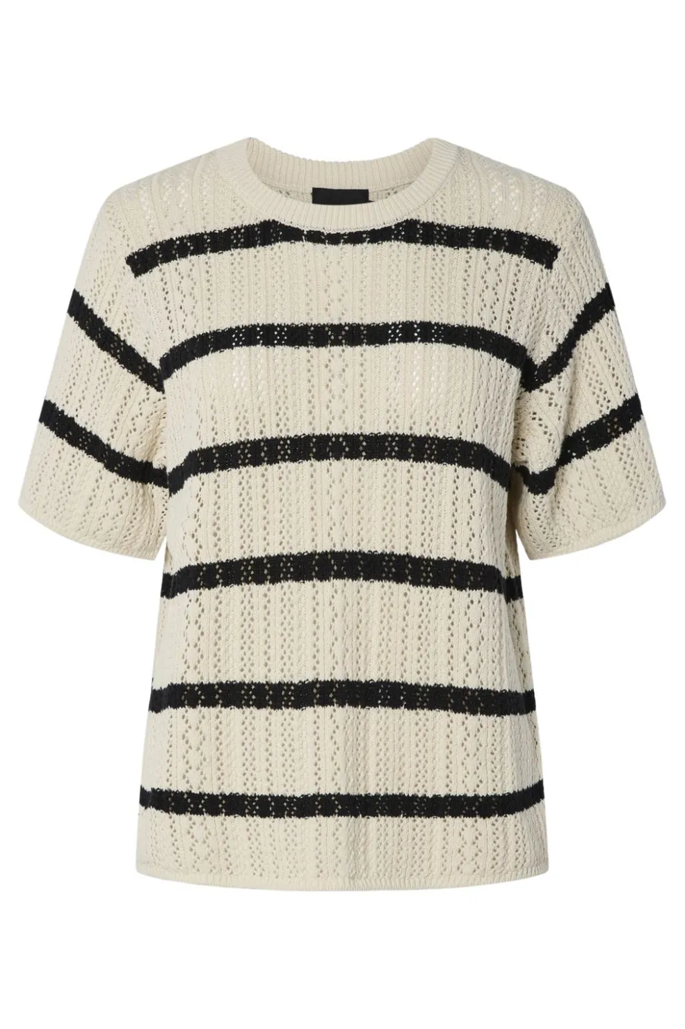 Strikbluse fra Pieces med et stribet mønster i birch og sort. O-halsudskæring og korte ærmer giver blusen et åbent og luftigt design med struktureret strik.