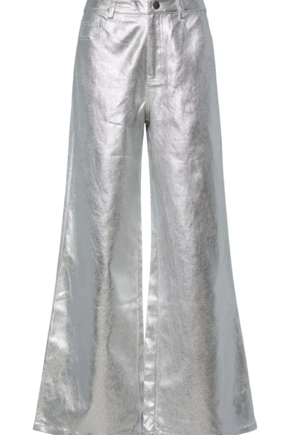 Sølvfarvede bukser fra Pieces med brede ben. Bukserne har en skinnende overflade og en løs pasform, der giver god bevægelsesfrihed.