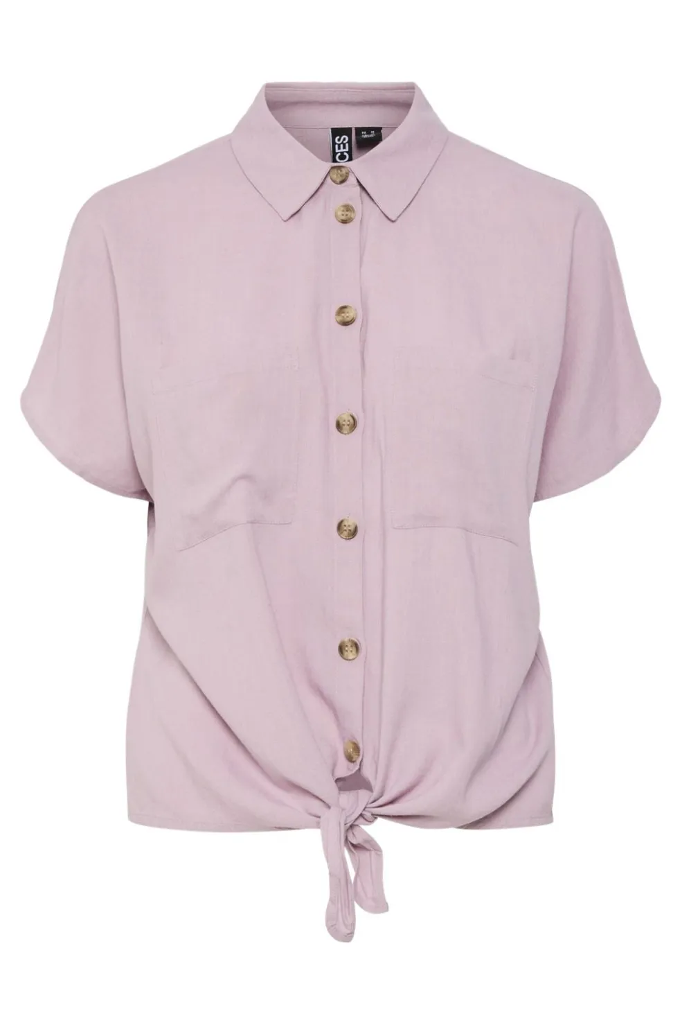 Lyserød skjorte fra Pieces med korte ærmer og skjortekrave. Skjorten har en knudedetalje i bunden og lukkes med knapper foran.