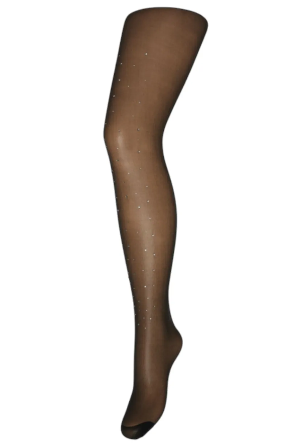 Sorte strømpebukser fra Pieces med klare sten og polka dot-mønster. Strømpebukserne har en åben fodsektion og er dekoreret med perler og pailletter langs benet.