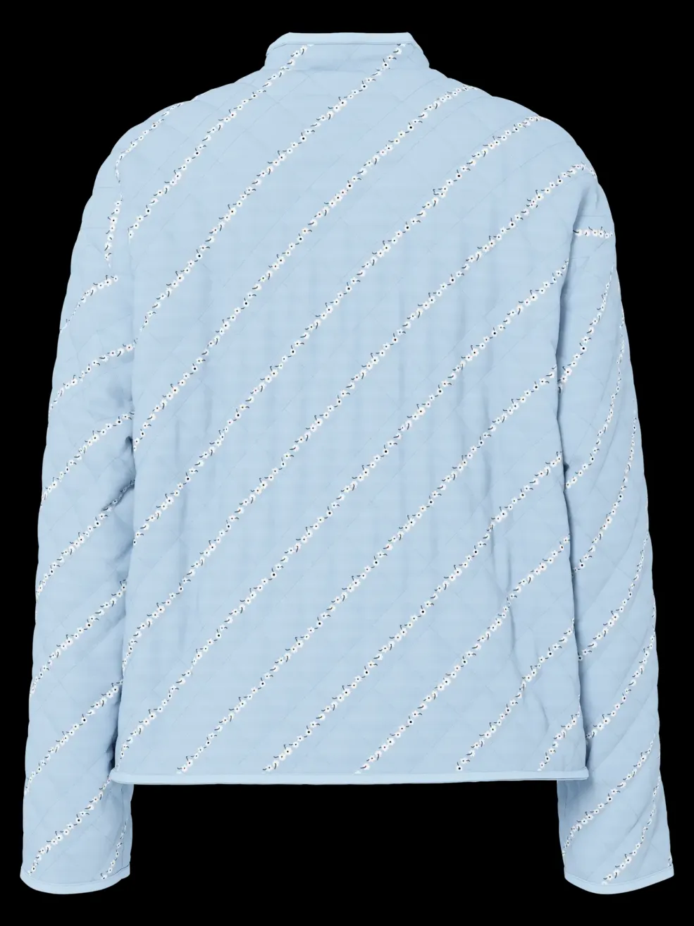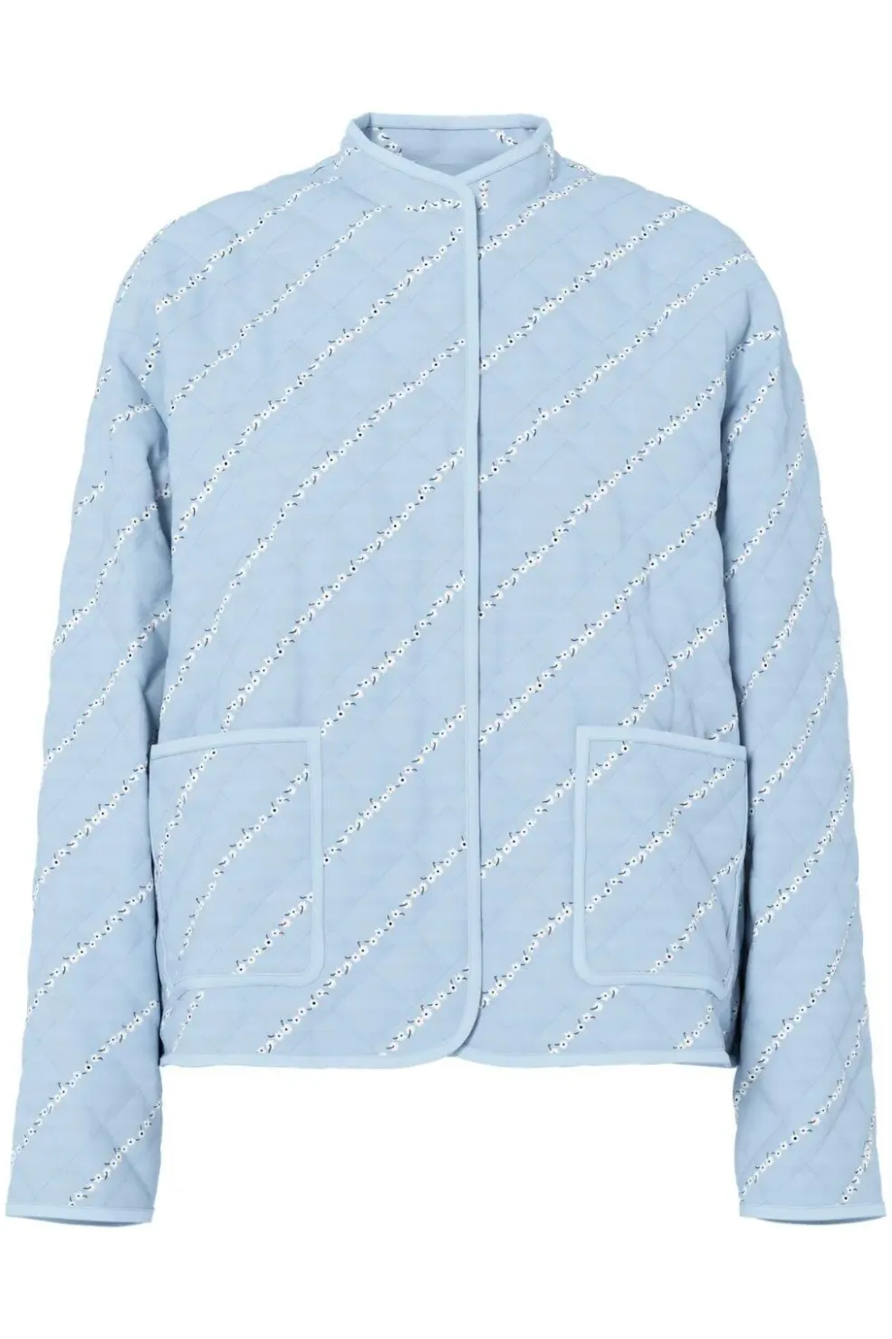 Quiltet jakke fra Pieces i lyseblå nuance med et mønster af blomster, striber og tern. Jakken er lavet af 100 % viskose.