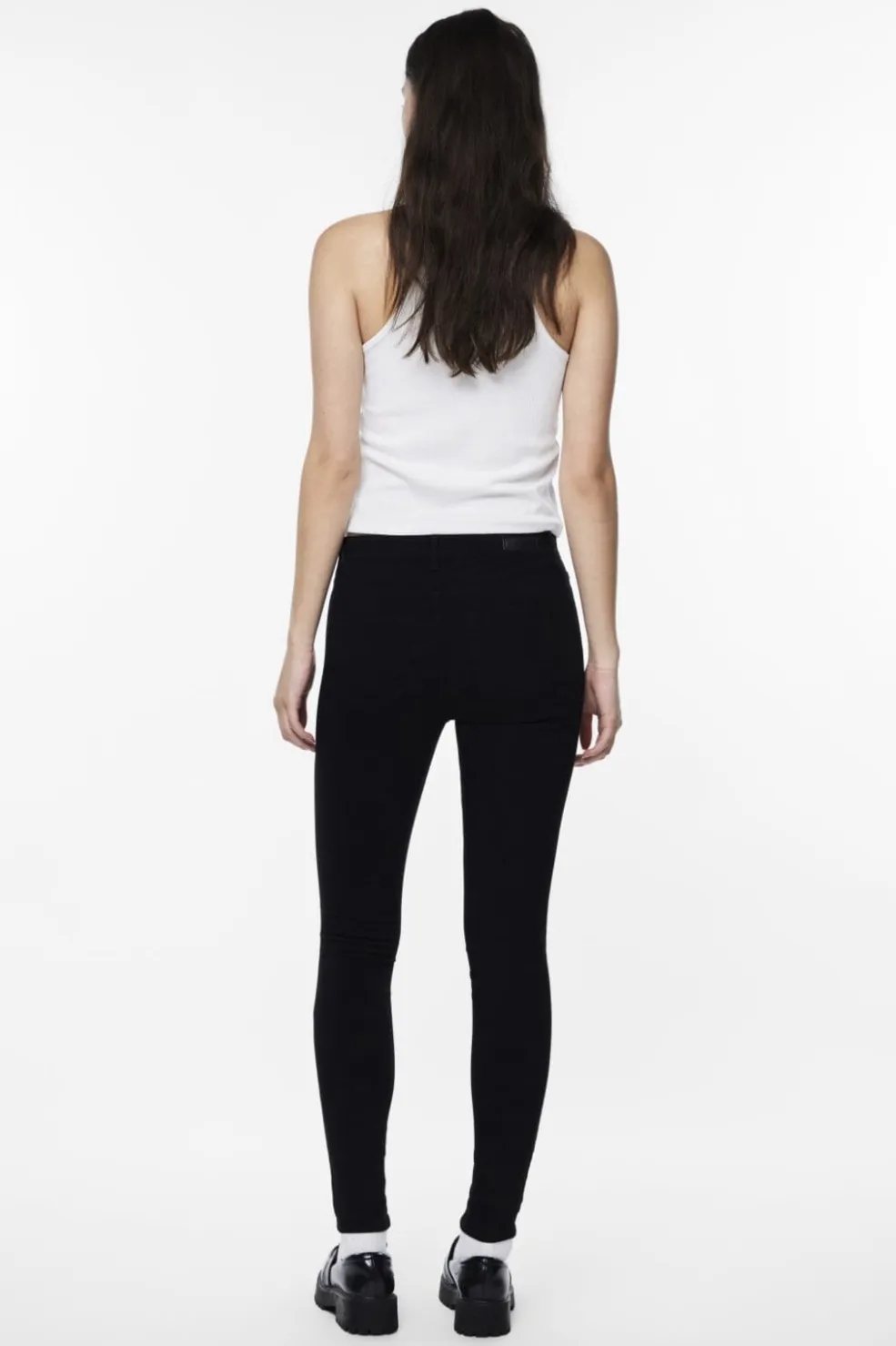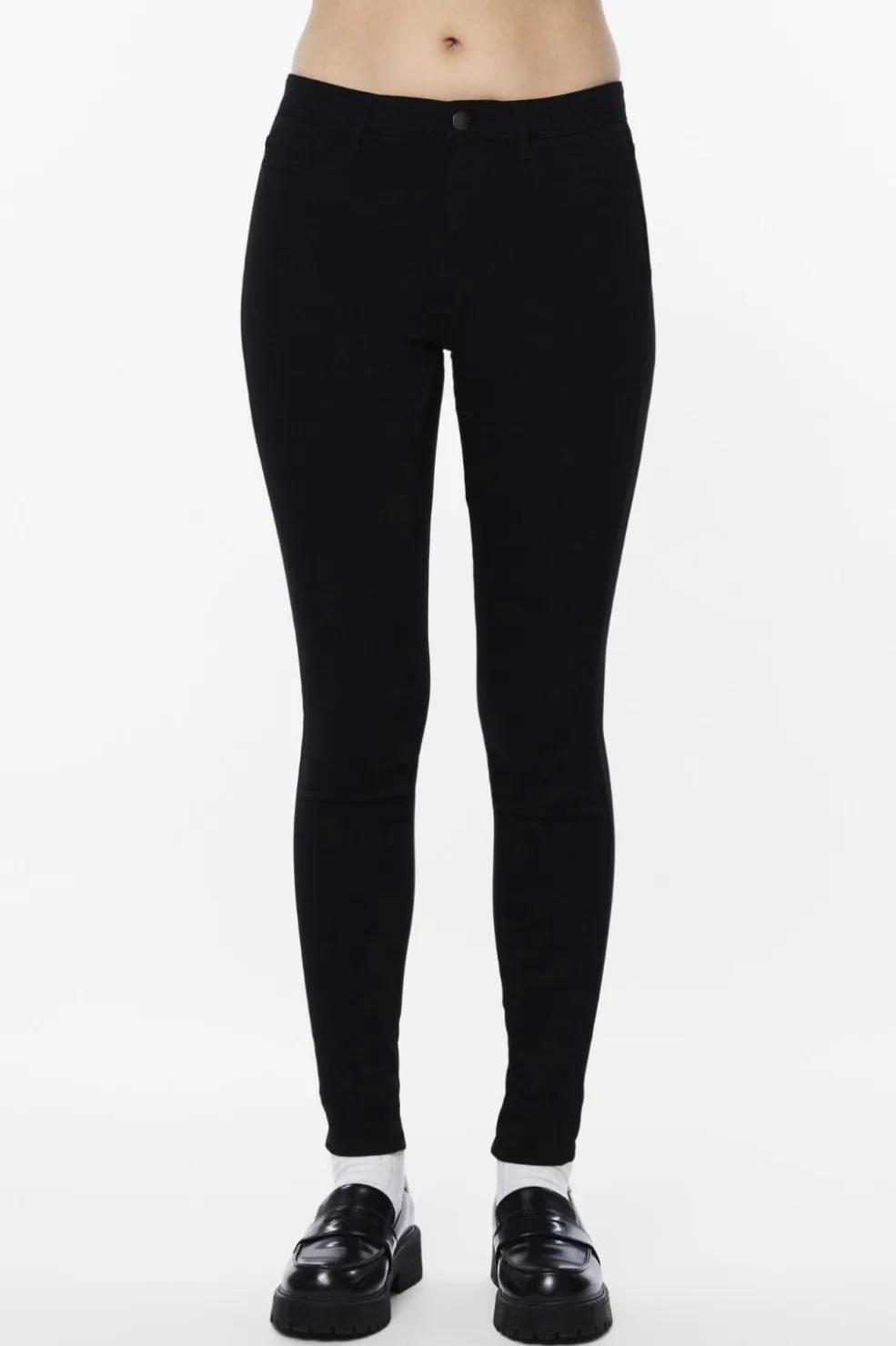 Sorte jeggings fra Pieces med tætsiddende pasform og mellemhøj talje. Jeggingsene har en strækbar kvalitet, der gør dem behagelige at have på, både til hverdag og fest.