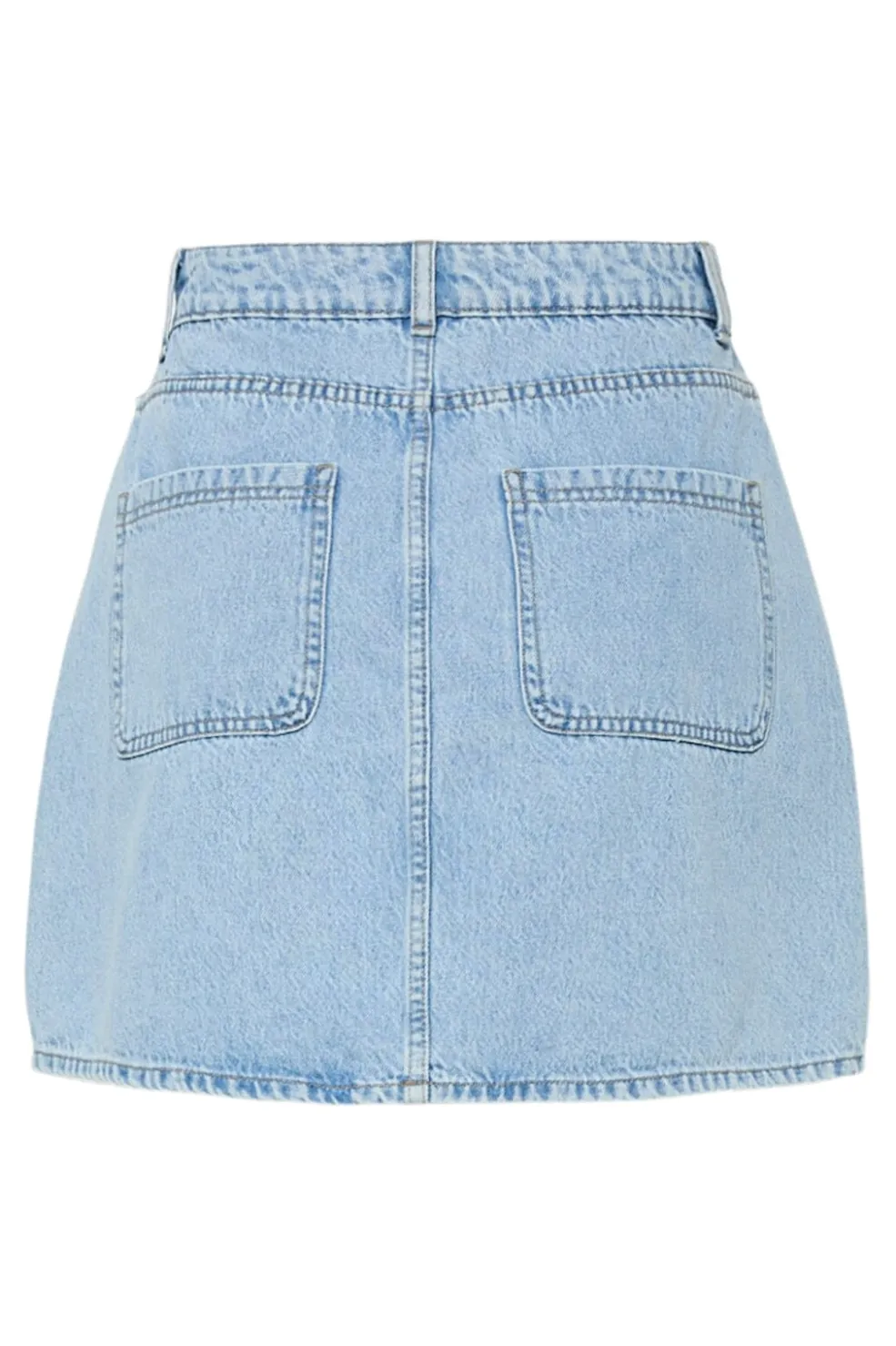 Mini denimskørt fra Pieces i lys blå denim. Skørtet har en regulær taljehøjde og to frontlommer med dekorative syninger, der giver det klassiske denimlook.
