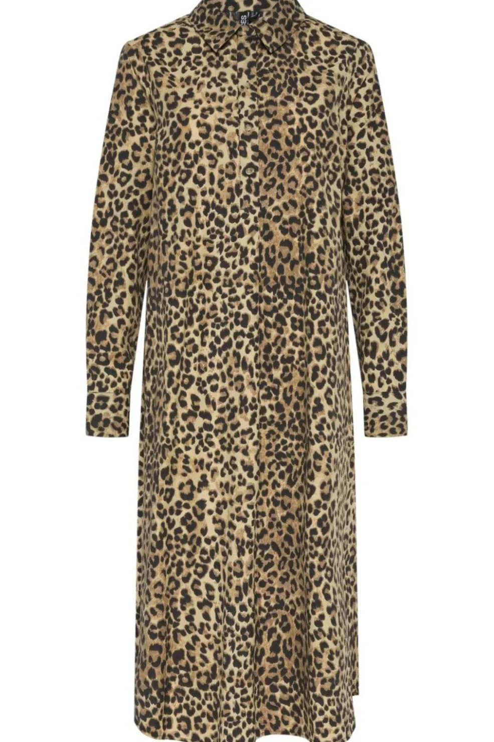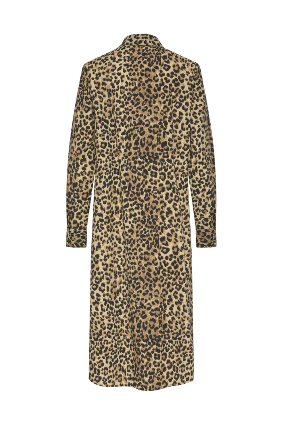 Midi skjortekjole fra Pieces med brunt og beige leopardprint. Kjolen har skjortekrave og knapper hele vejen ned foran.