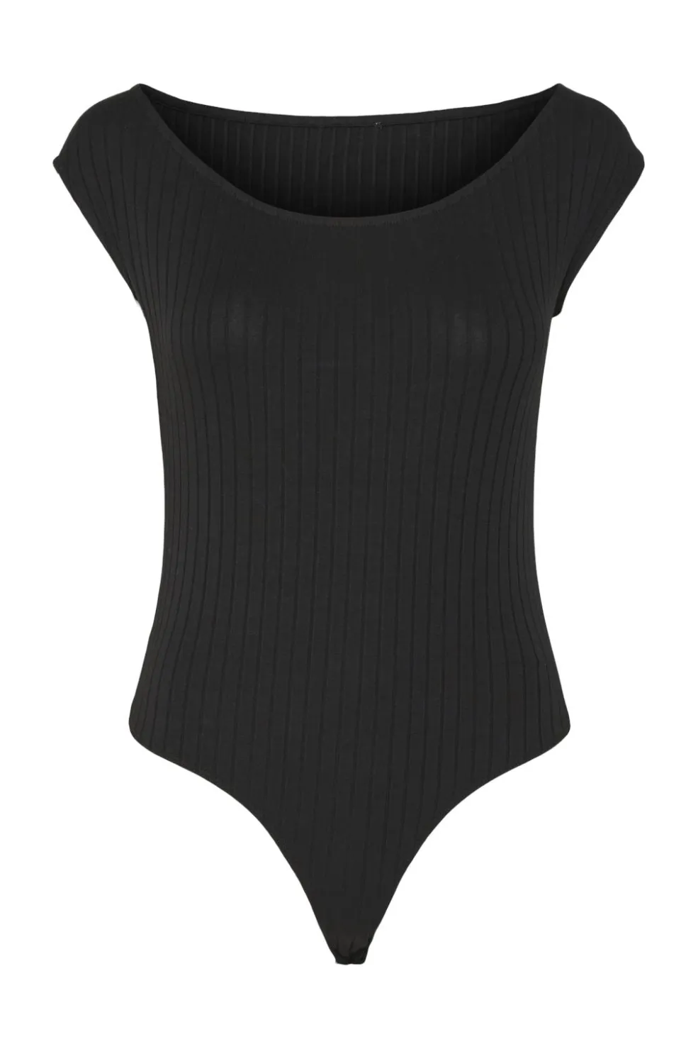 Sort bodystocking fra Pieces i ribstof. Den har bådhals og ærmeløst design med en tætsiddende pasform i hoftelængde.