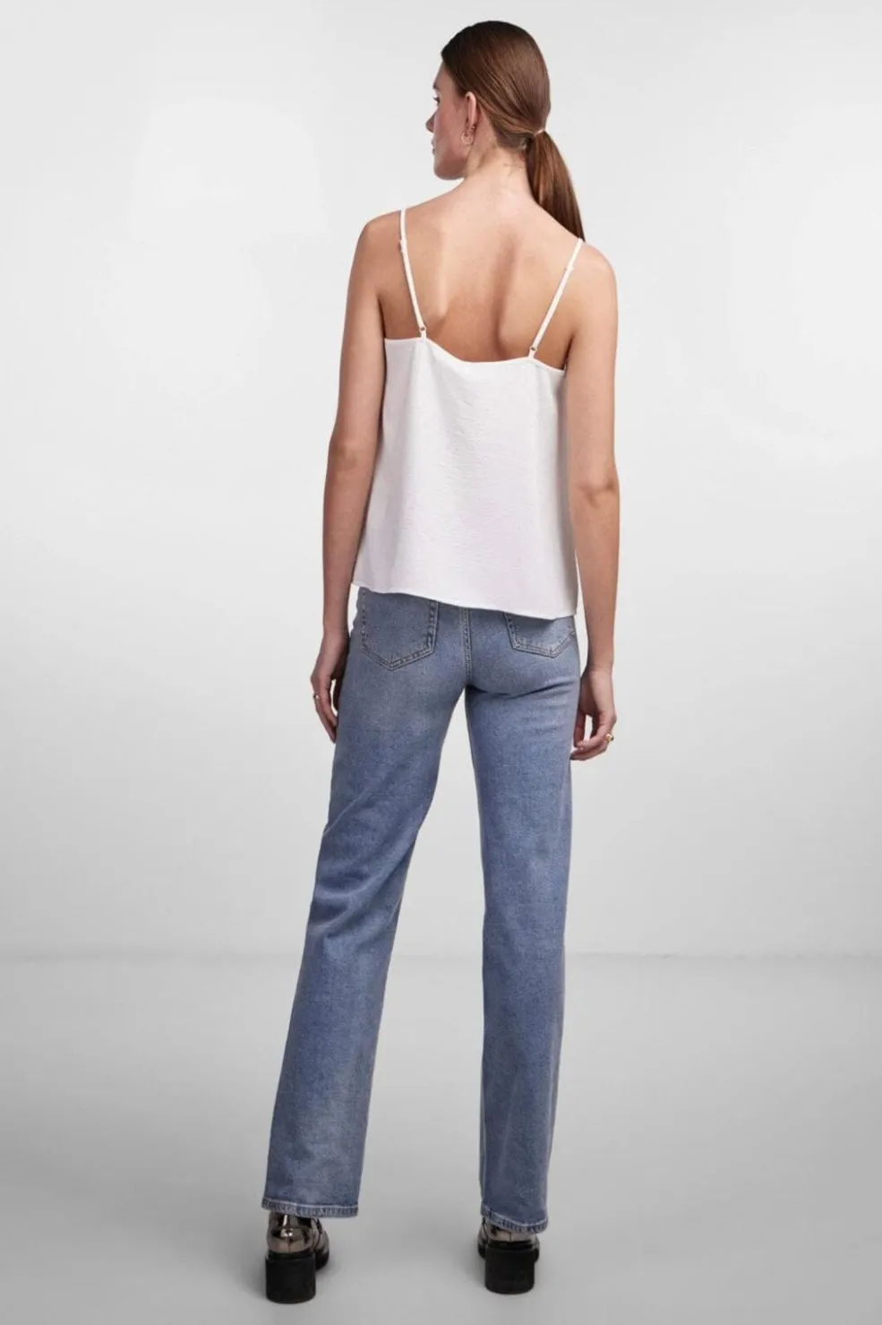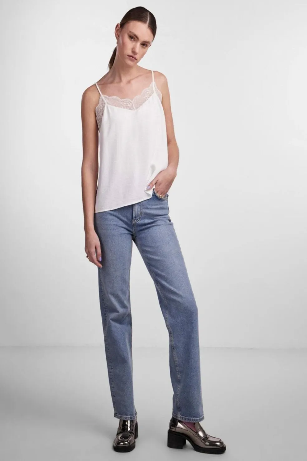Hvid top fra Pieces med tynde stropper og blondedetaljer. Toppen har en V-udskæring med blondekant og en løs pasform, der giver god bevægelsesfrihed.