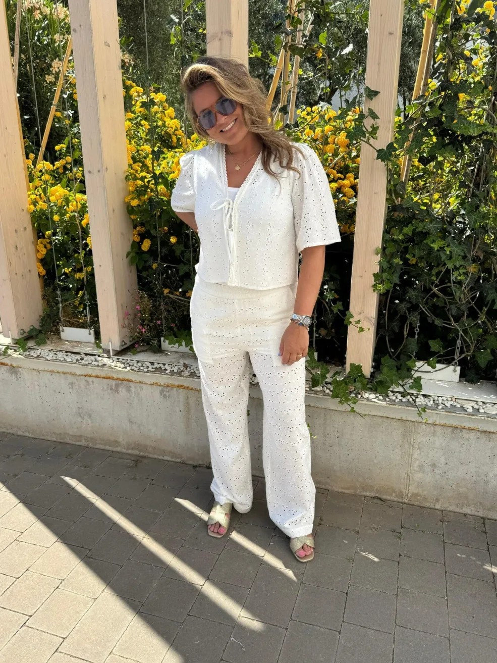 Hvid top fra Pieces i Broderie Anglaise med V-udskæring og bindebånd. Toppen har fine udskæringer i stoffet og 2/4-ærmer med let volumen. Fremstillet i farven Cloud Cream.