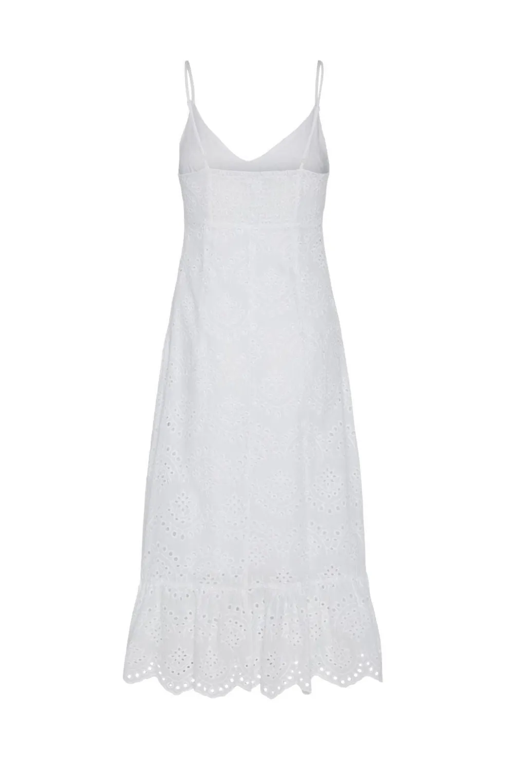 Hvid kjole fra Pieces i Broderie Anglaise-stof med udskæringer. Kjolen har tynde stropper og en V-halsudskæring, der går ned til en læg knælængde med flæsekant.