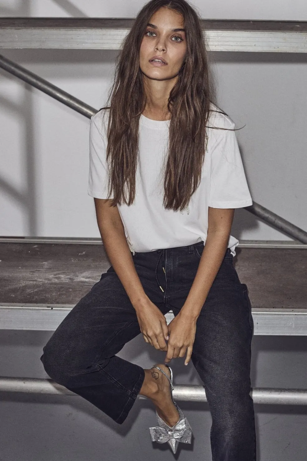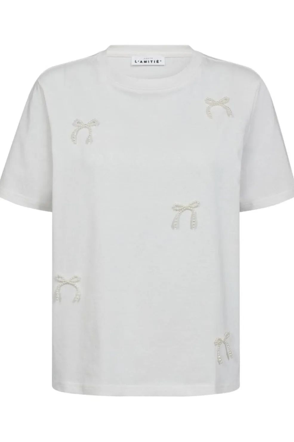 En off-white T-shirt fra Haute L’Amitié med perlebue-dekorationer på forsiden. T-shirten har korte ærmer og rund hals.
