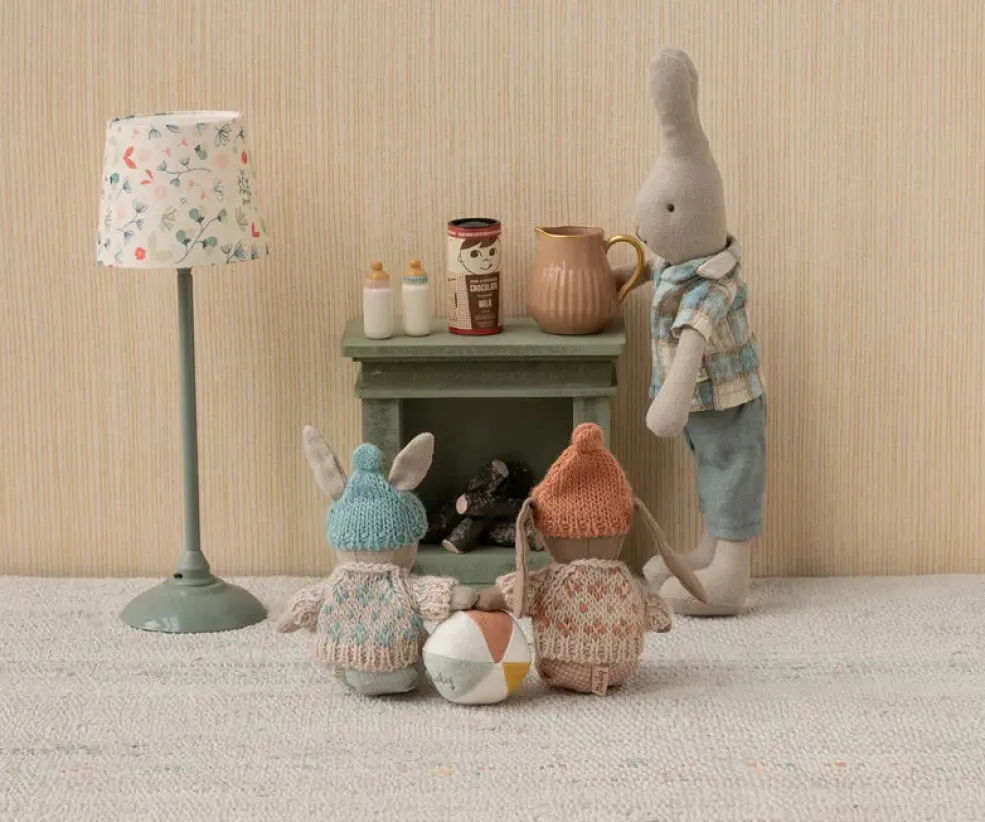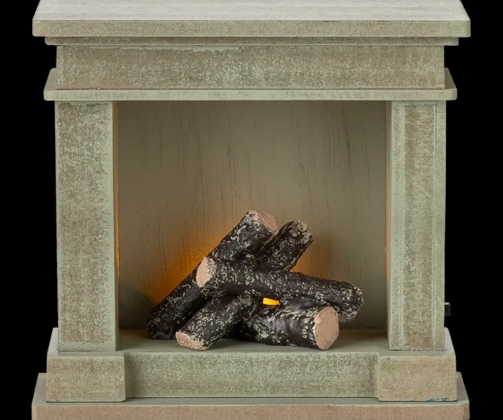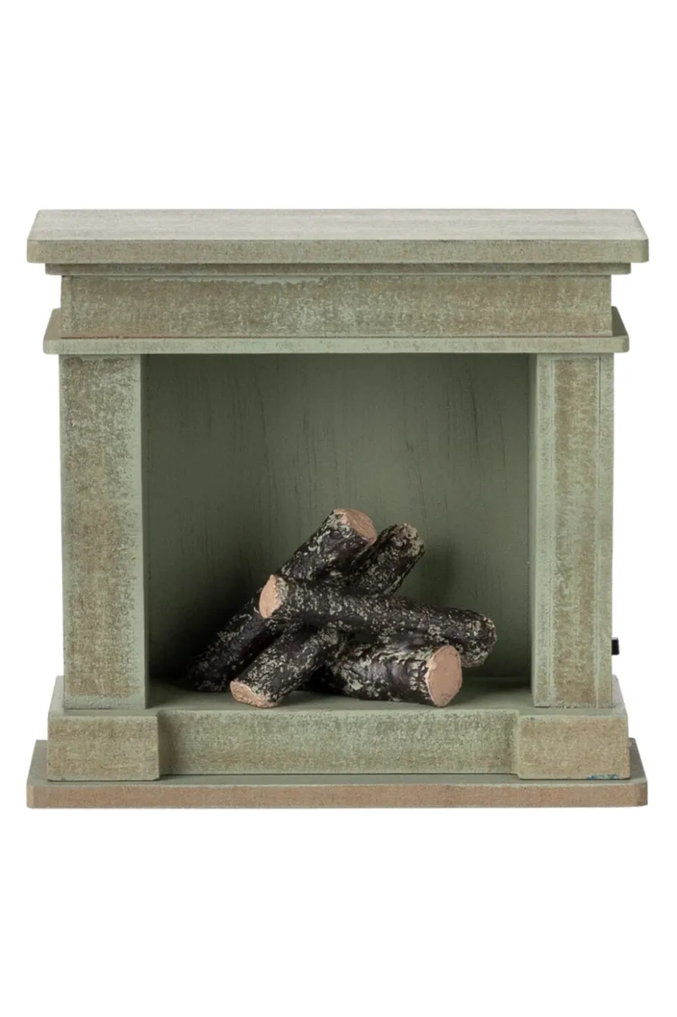 En miniaturepejs fra Maileg i støvet grøn med vintage-maling. Pejsen er designet til Maileg House of Miniature og har miniaturetræstammer indeni.