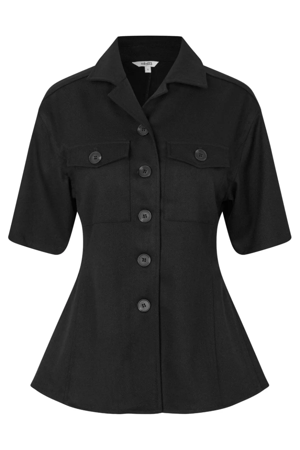 Sort skjorte fra MbyM i en polyesterblanding. Skjorten har en skjortekrave, korte ærmer og knaplukning foran med to brystlommer med knapper.
