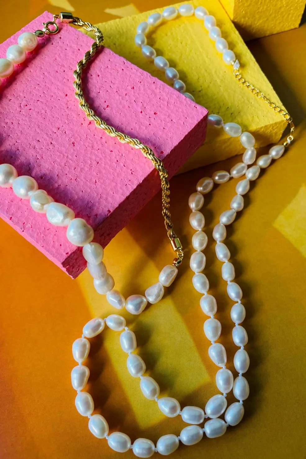 Halskæde fra Mellow Moon med naturperler og forgyldt sterling sølv. Det har perler på den ene halvdel og guldkæde på den anden, og er helt nikkel- og blyfrit.