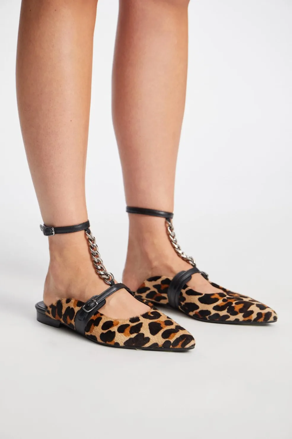 Sko fra Munthe med spids tå og åben hæl. Skoene har et leopardprint i camelfarvet læder og en sort ankelrem med kædedetalje fra ankel til vrist.