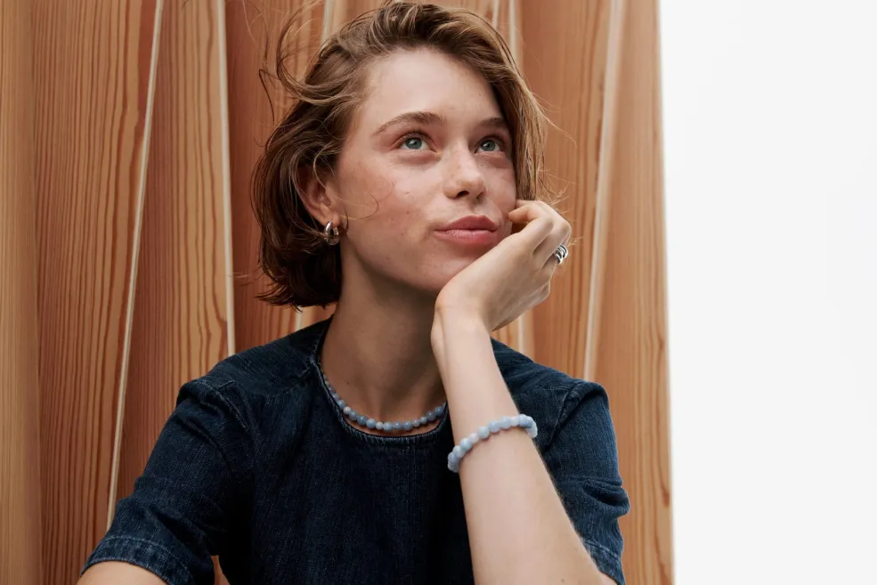 Armbånd fra Pernille Corydon i forgyldt genbrugssølv med lysblå aquamarine-sten. De blå sten kommer i forskellige størrelser og skaber en harmonisk kombination med den gyldne finish.