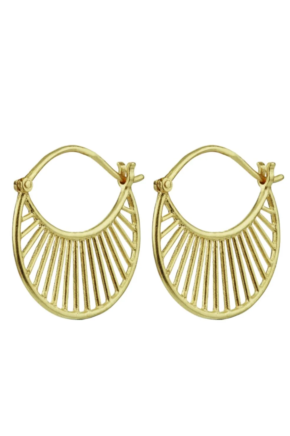 Gyldne øreringe fra Pernille Corydon med halvmåneform og striber. De lette øreringe har en prægning på overfladen med fine detaljer i det guldbelagte sølv.