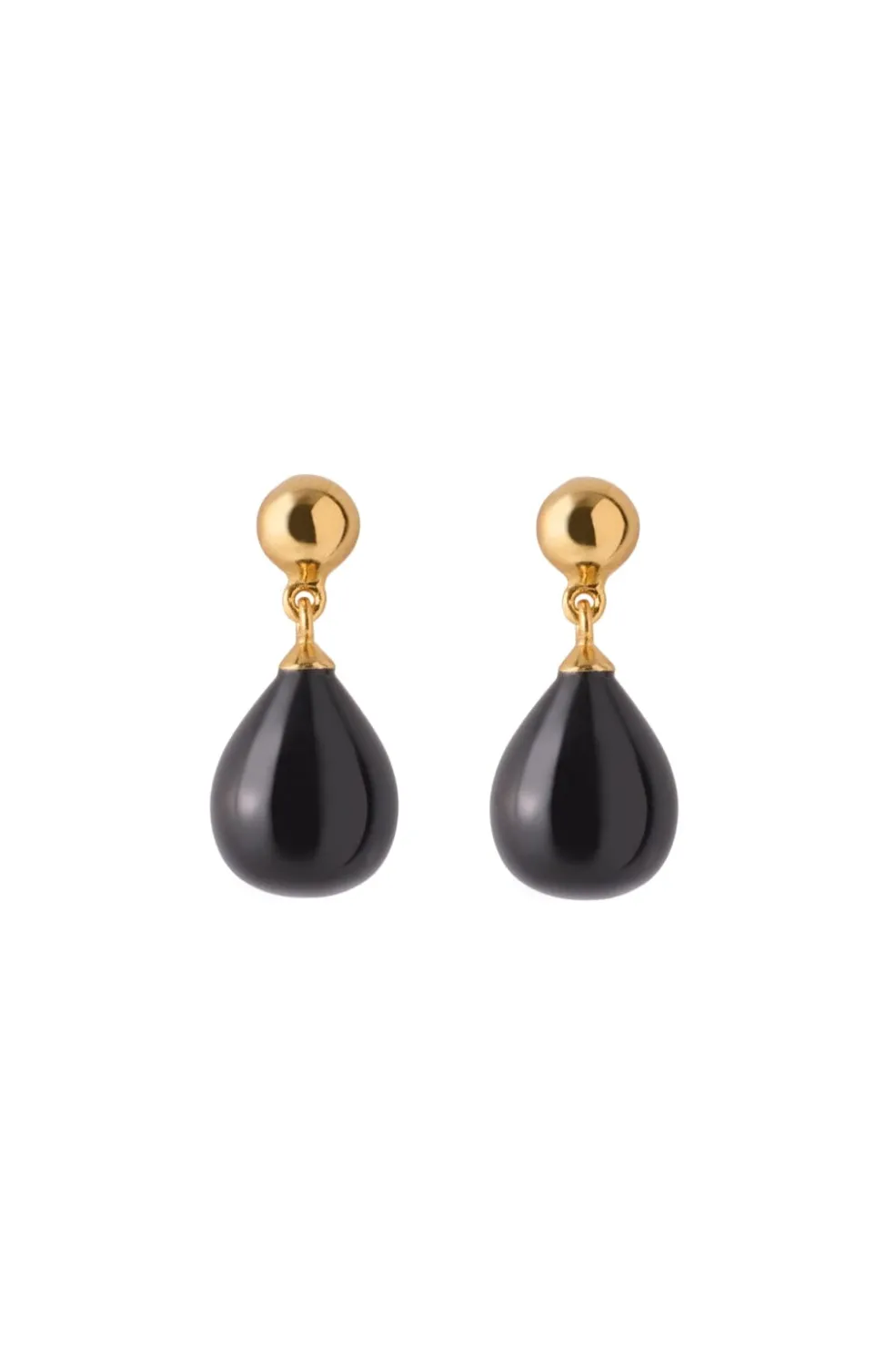 Øreringe fra Pernille Corydon med gylden top og sort dråbeformet vedhæng. De lette øreringe er fremstillet i guldbelagt sterling sølv med et enkelt design.