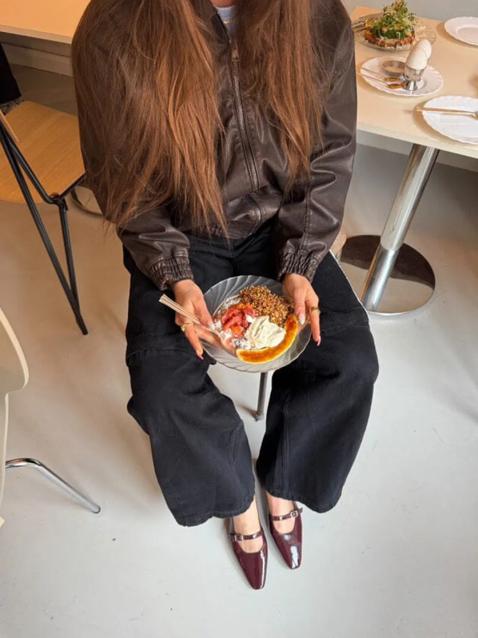 Ballerinaer fra Phenumb Copenhagen i bordo patentlæder. Skoen har en blank overflade, spids tå og lukning med spænde.