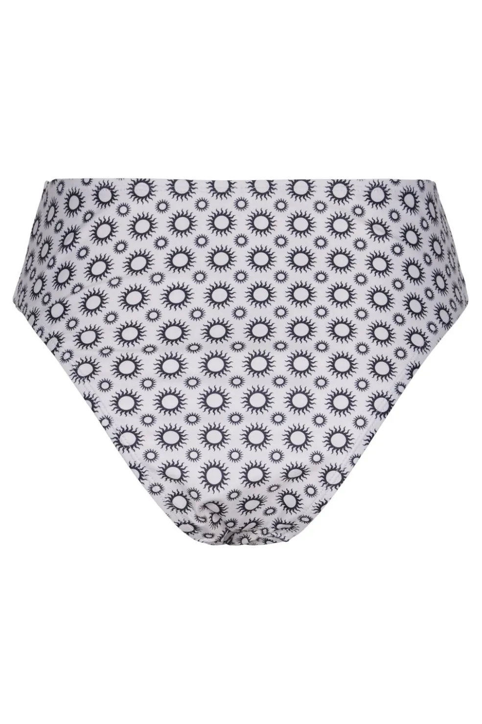 Højtaljede bikinitrusser fra Pieces med et gennemgående solprint på hvid baggrund. Designet har en høj talje og er fremstillet med fokus på komfort og støtte.