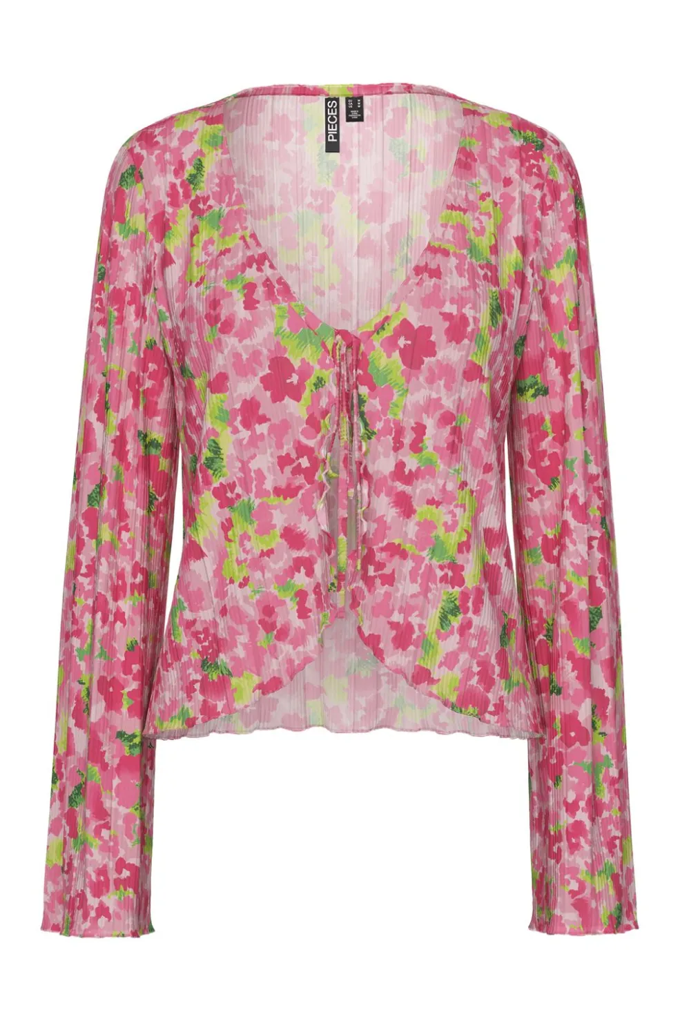 Langærmet top fra Pieces med blomsterprint i pink og grønne nuancer. Toppen har en V-halsudskæring med bindedetalje og en let transparent kvalitet.