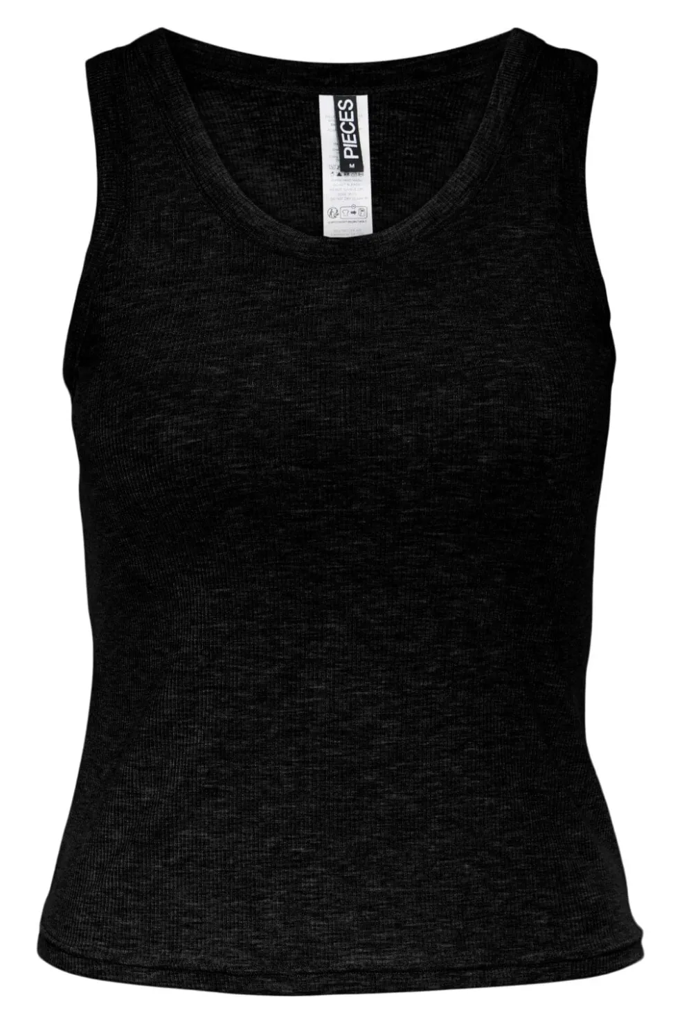 Sort bra-top fra Pieces med tætsiddende pasform. Toppen har en rund halsudskæring med ribkant og et ærmeløst design, der giver god bevægelsesfrihed.