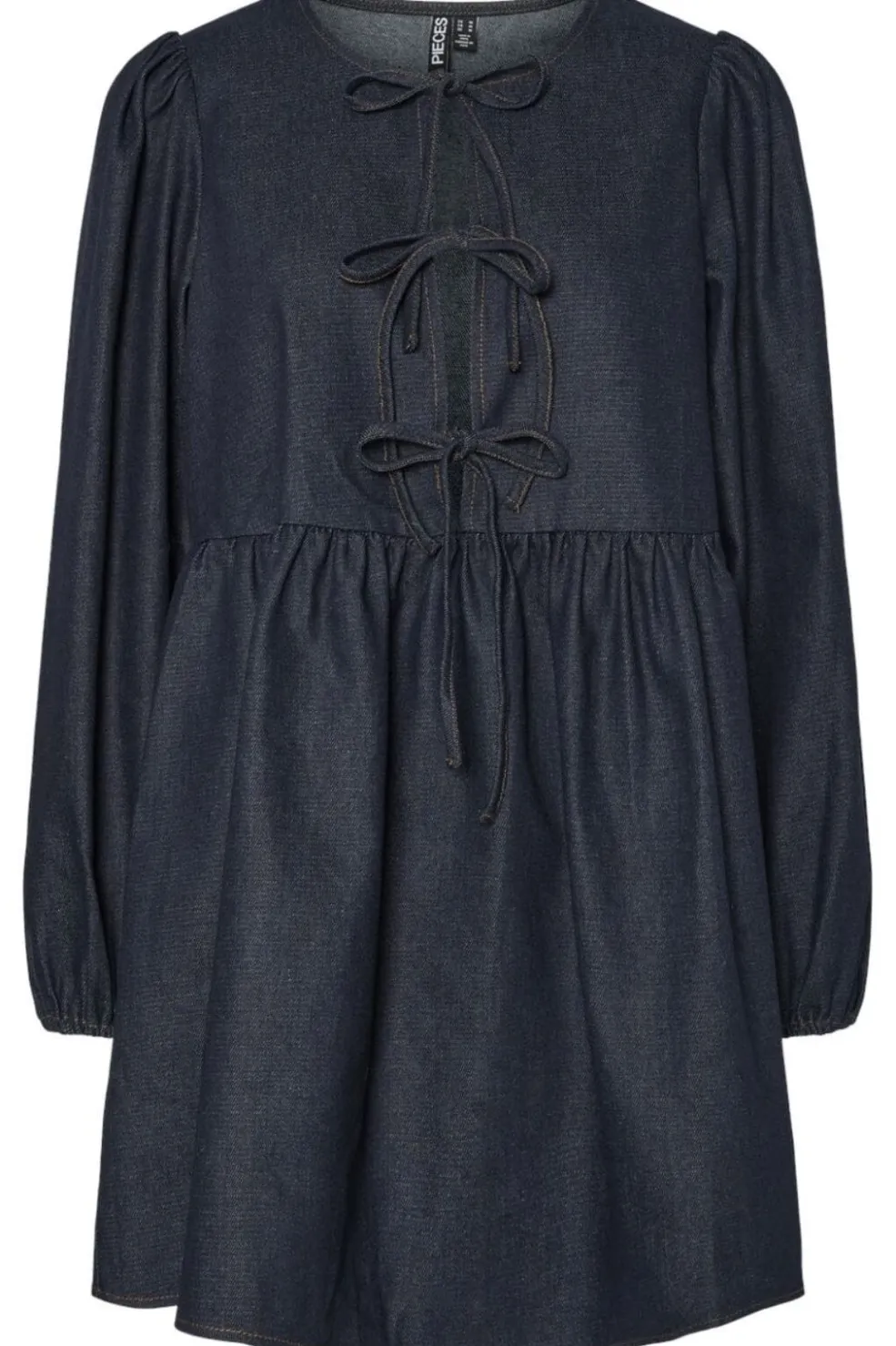 Denimkjole fra Pieces i mørkeblå ubehandlet denim. Kjolen har en rund halsudskæring med bindebånd og lange puffede ærmer.