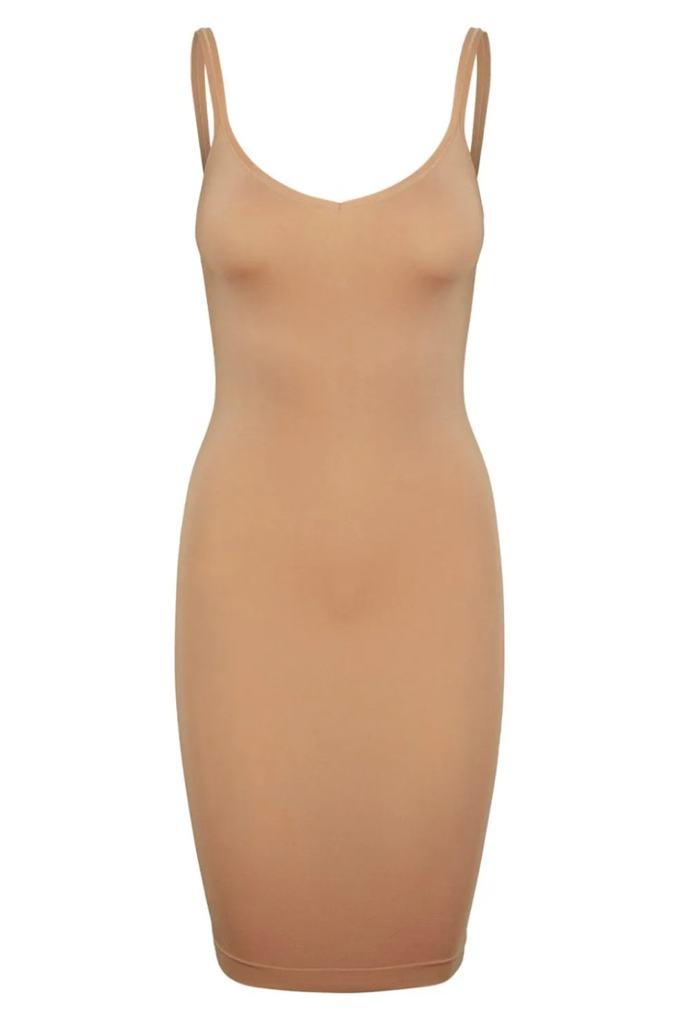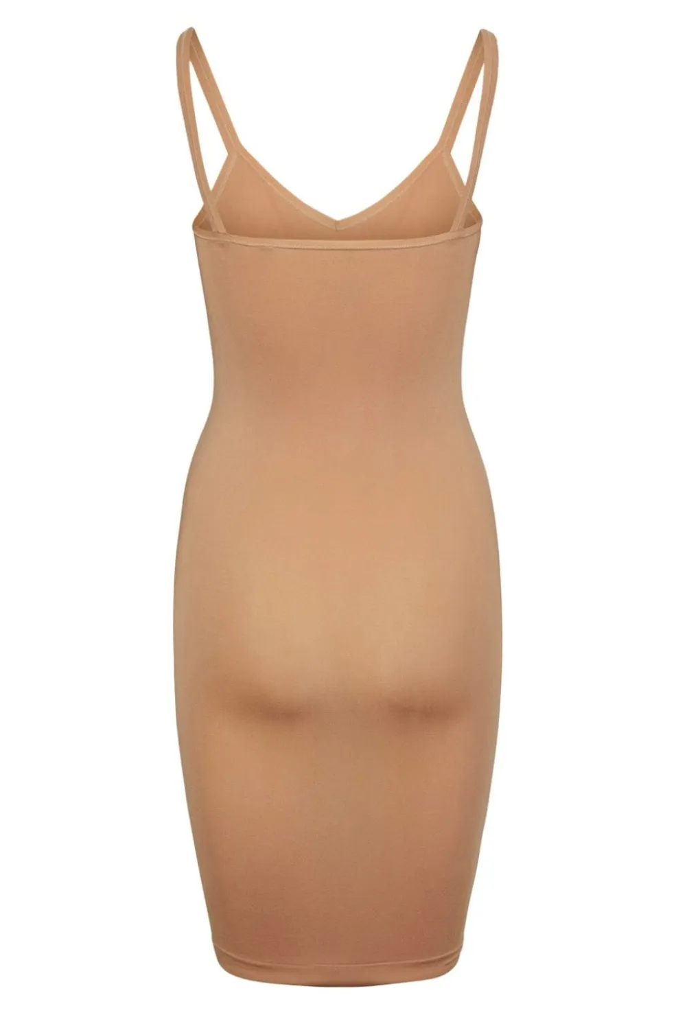 Beige singletkjole fra Pieces i knælængde med V-udskæring. Den tætsiddende kjole har tynde stropper og kan bruges både som underkjole og som selvstændig kjole.