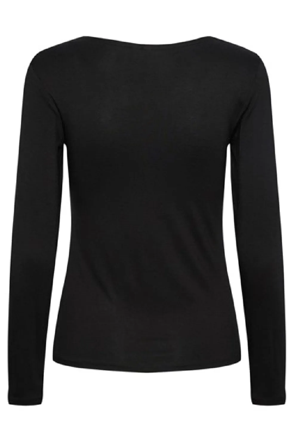 Sort langærmet bluse fra Pieces med blondedetaljer langs V-udskæringen. Blusen har en almindelig pasform og kan bruges til både hverdag og fest.