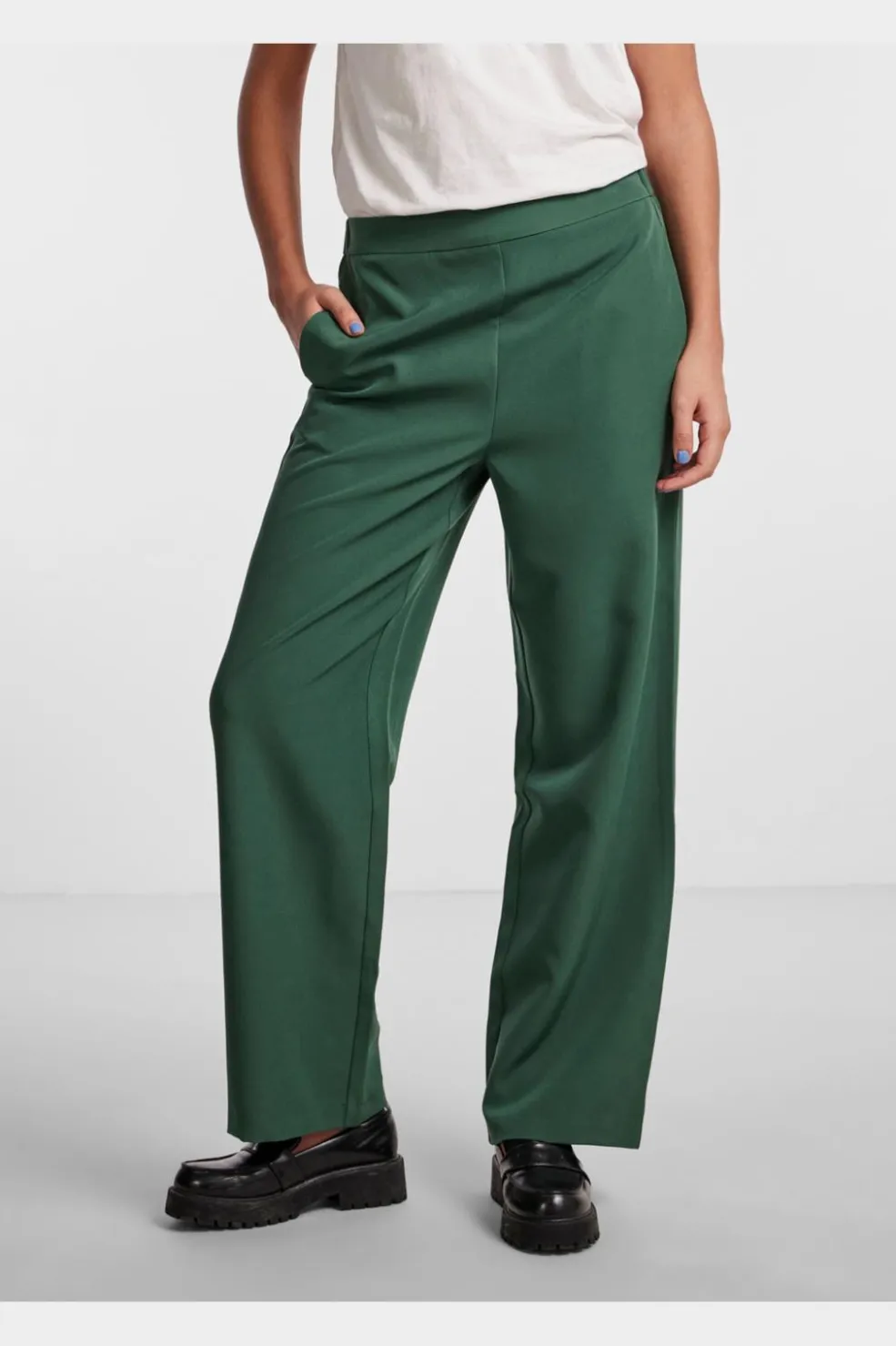 Bukser fra Pieces i mørkegrøn med løs pasform. De har høj talje med elastik og går til midt på læggen.