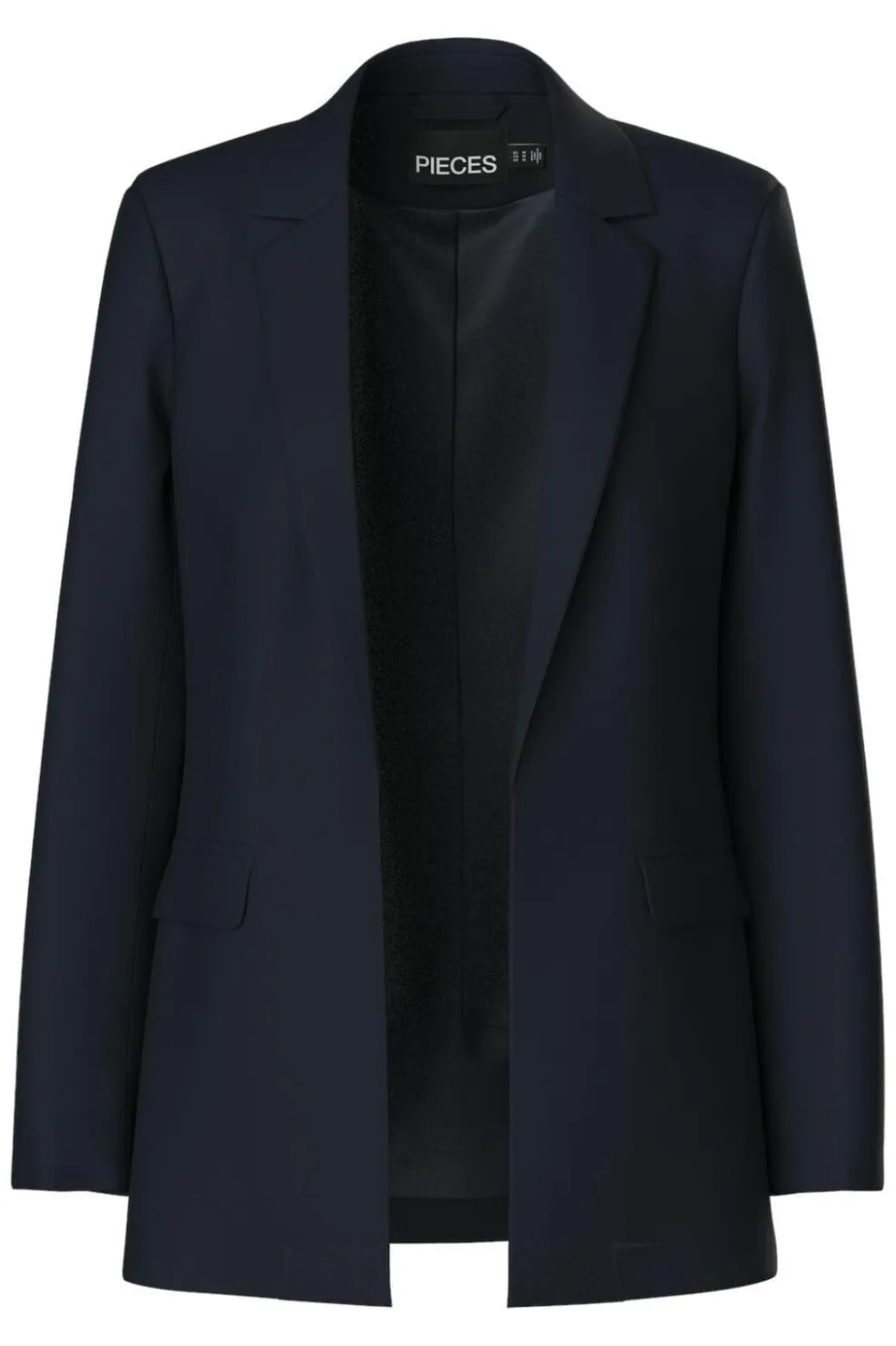 Mørkeblå blazer fra Pieces i oversize pasform. Den har en klassisk skjortekrave og lange ærmer. Blazeren kan bruges til både formelle og afslappede anledninger.
