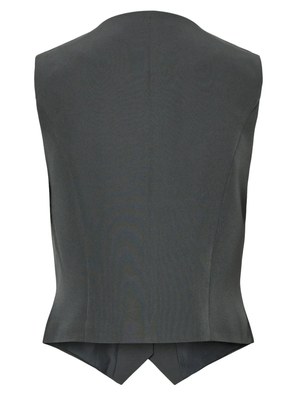 Mørk grå vest fra Pieces med v-hals og polyesterforing. Den har en silkelignende overflade og lukkes med knapper foran. Vesten har snydelommer og dekorative syninger.