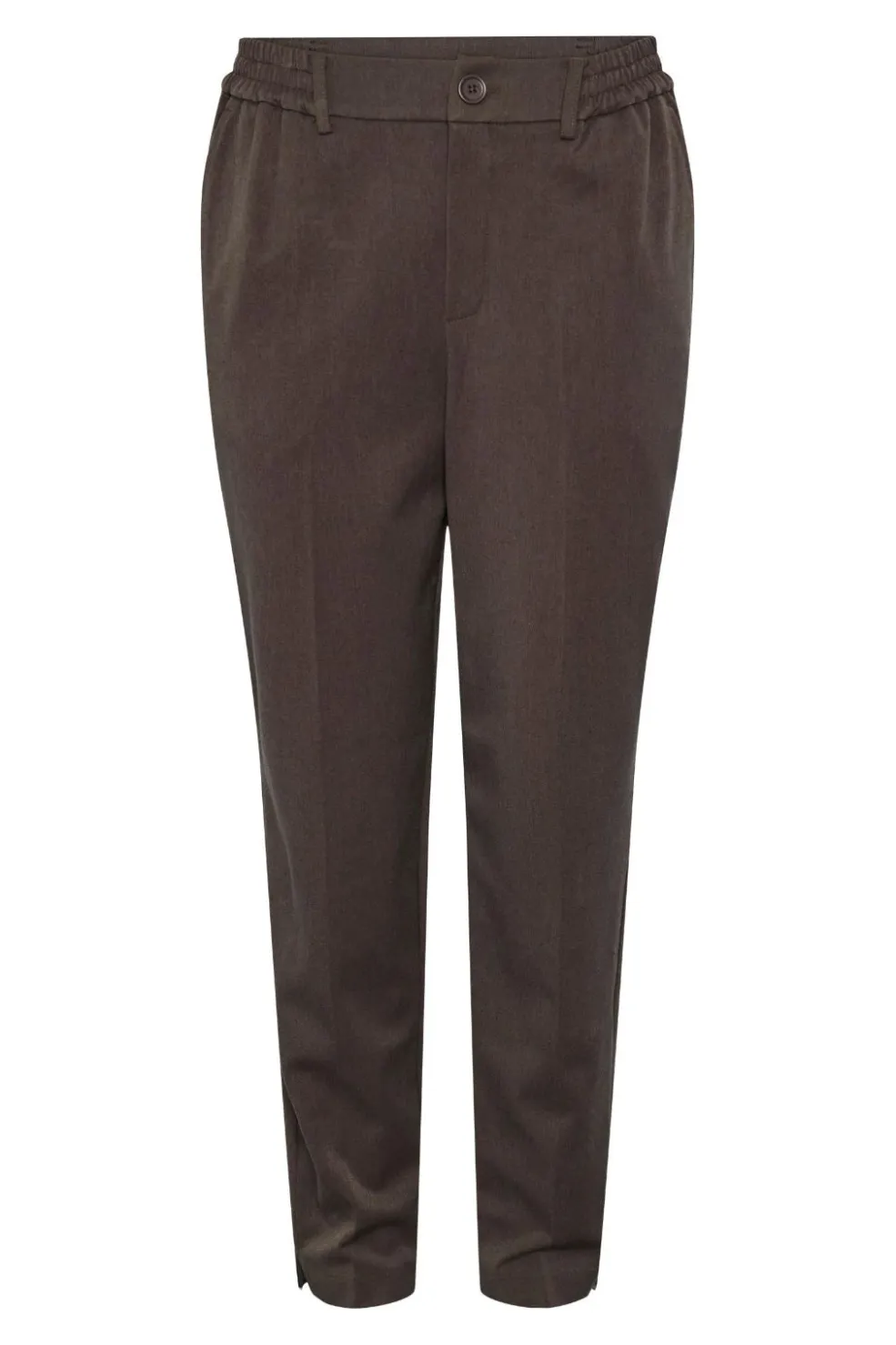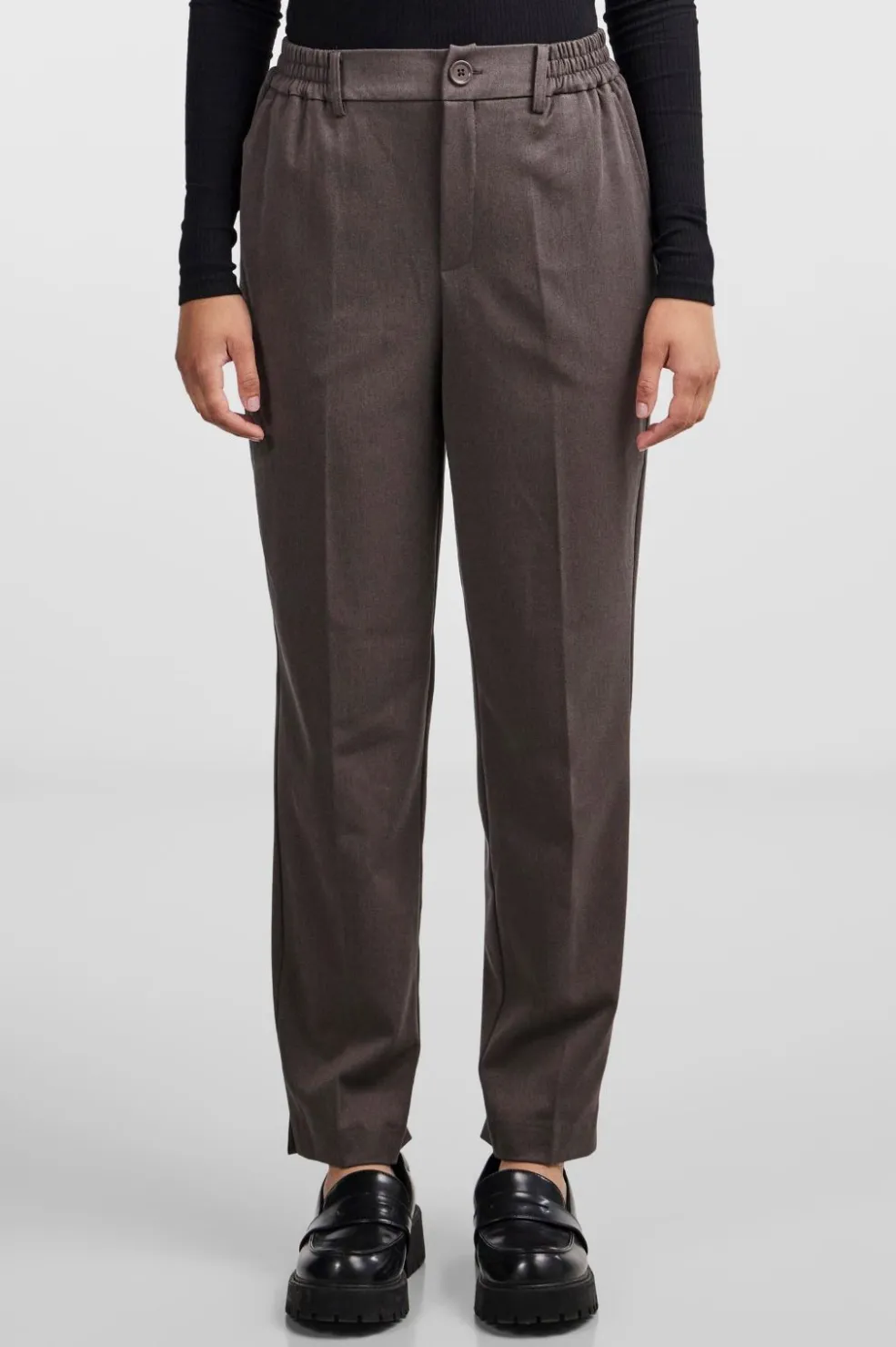 Brune bukser fra Pieces med regular fit. Bukserne har elastisk talje med knap og sidelommer. De lange bukser kommer i en neutral morel-farve, der er nem at style.