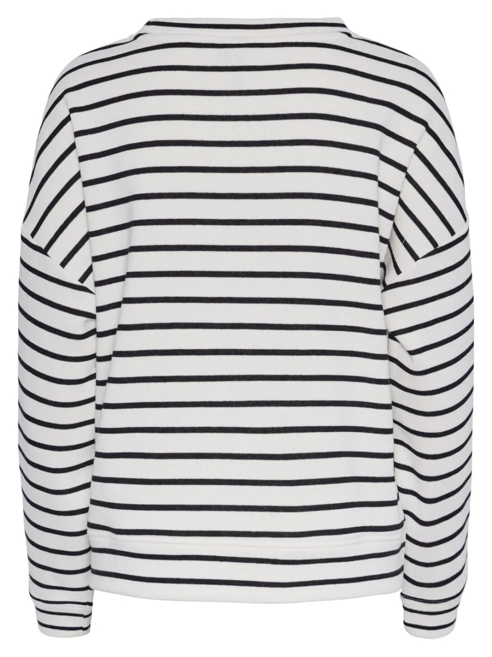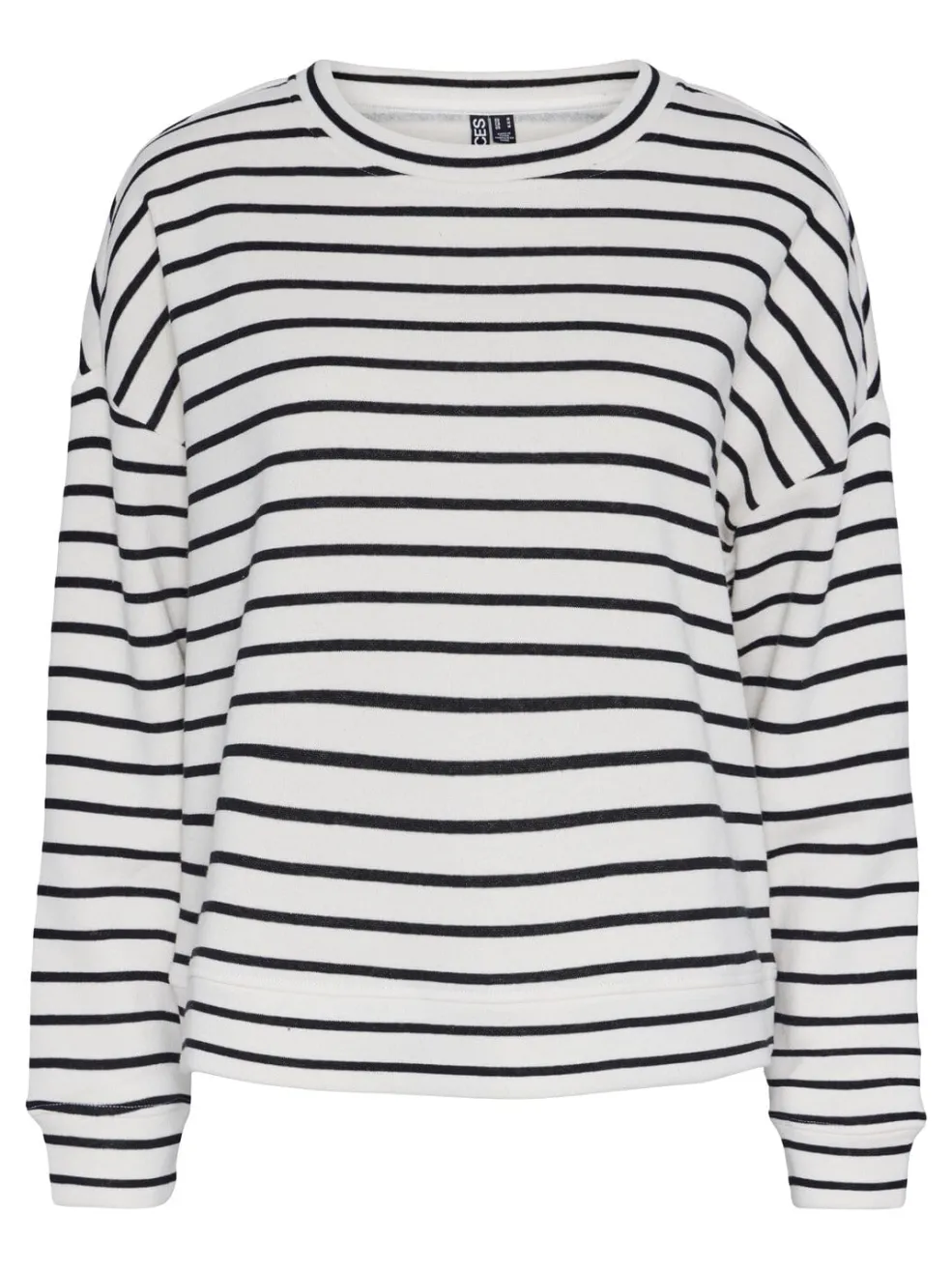 Stribet sweatshirt fra Pieces med sorte striber på hvid baggrund. Den har en løs pasform og lange ærmer med ribkant ved håndleddene.
