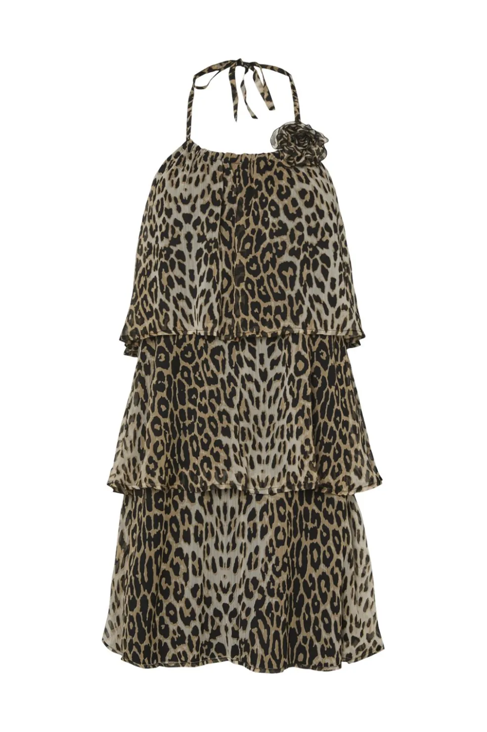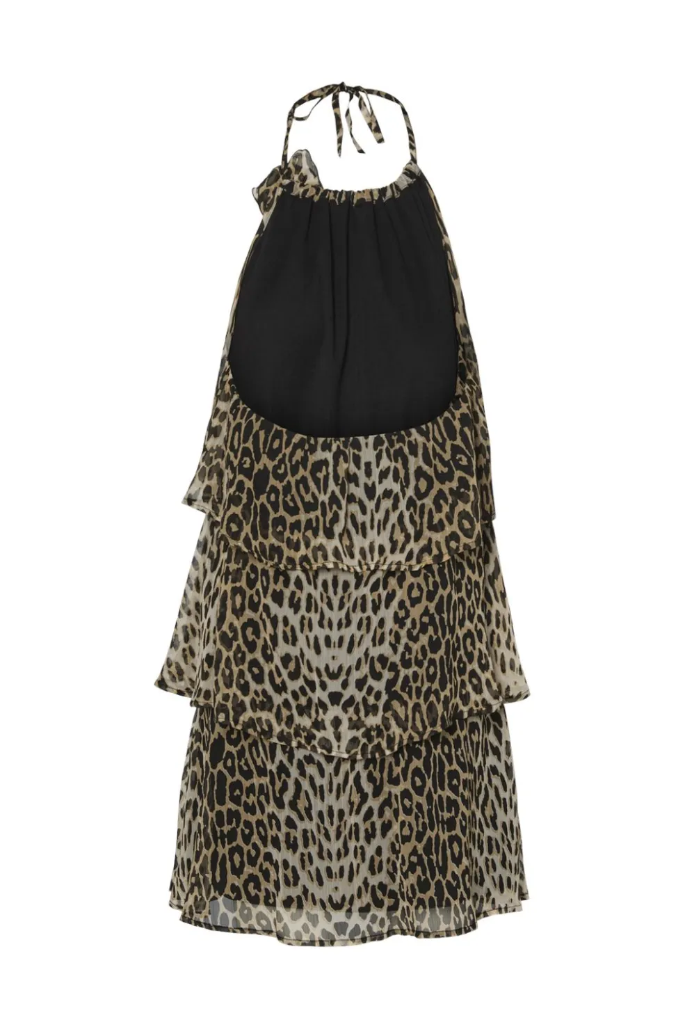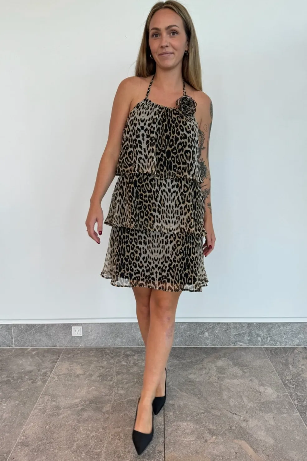 Kort kjole fra Pieces i sort leopardprint. Kjolen har et trelagsdelt design med halterneck og en blomsterdekoration på skulderen.