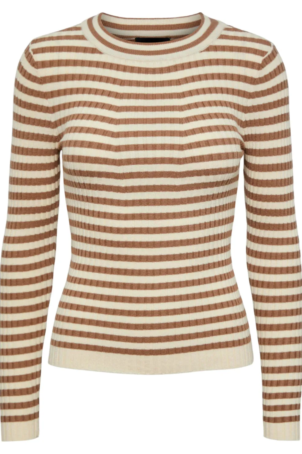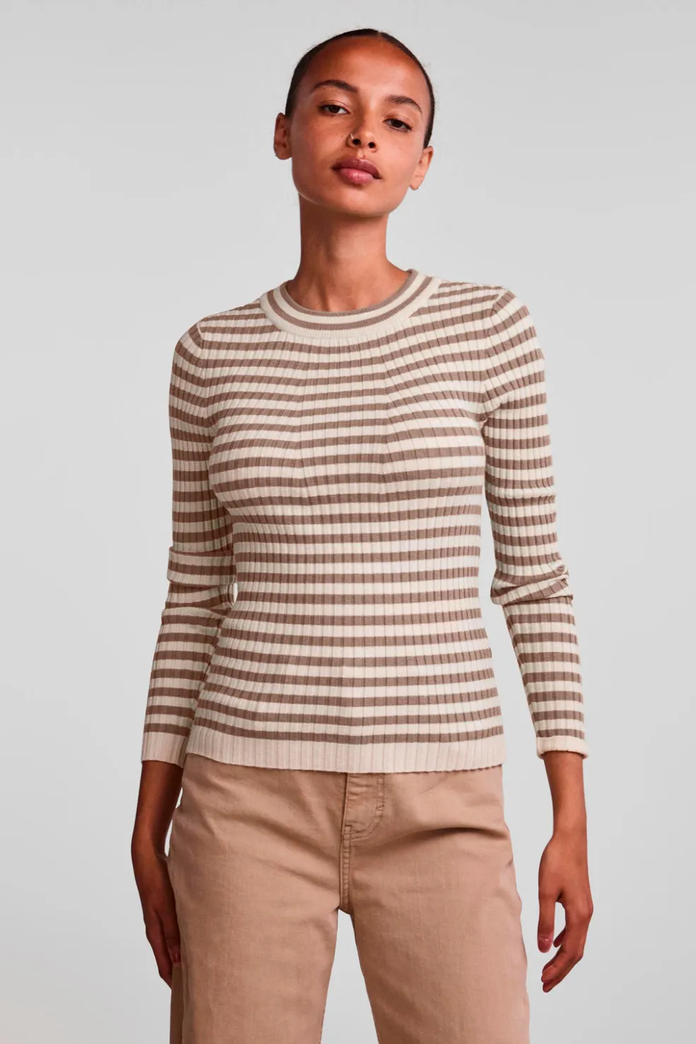 Stribet striktrøje fra Pieces med brune og cremefarvede vandrette striber. Ribstrikket design med rund hals og lange ærmer giver trøjen et struktureret udtryk.