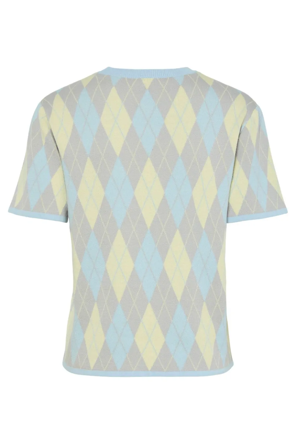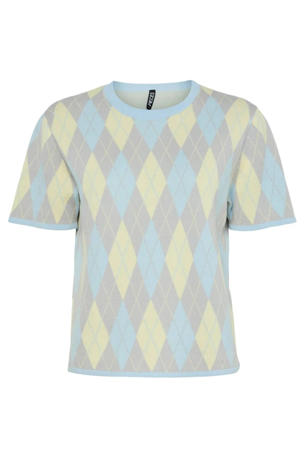 Strikket top fra Pieces med argyle-mønster i kølig grå, cashmere blå og lys banan. Toppen har rund halsudskæring og korte ærmer med en regular pasform.